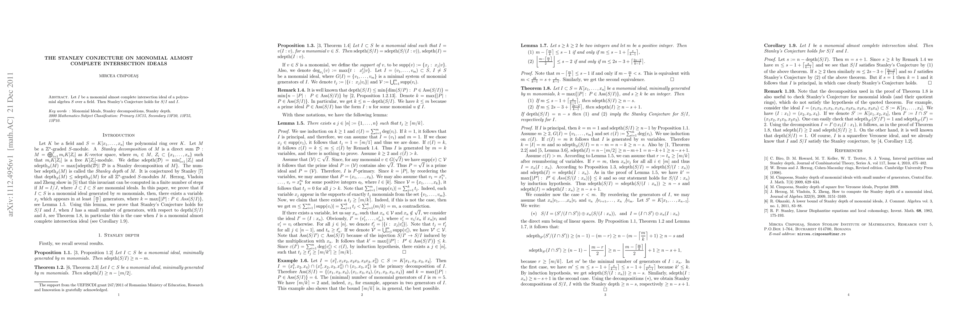 Summary: The paper proves Stanley's Conjecture for monomial almost complete intersection ideals $I$ in a polynomial algebra $S$ over a field, showing that the conjecture holds for both $S/I$ and $I$.