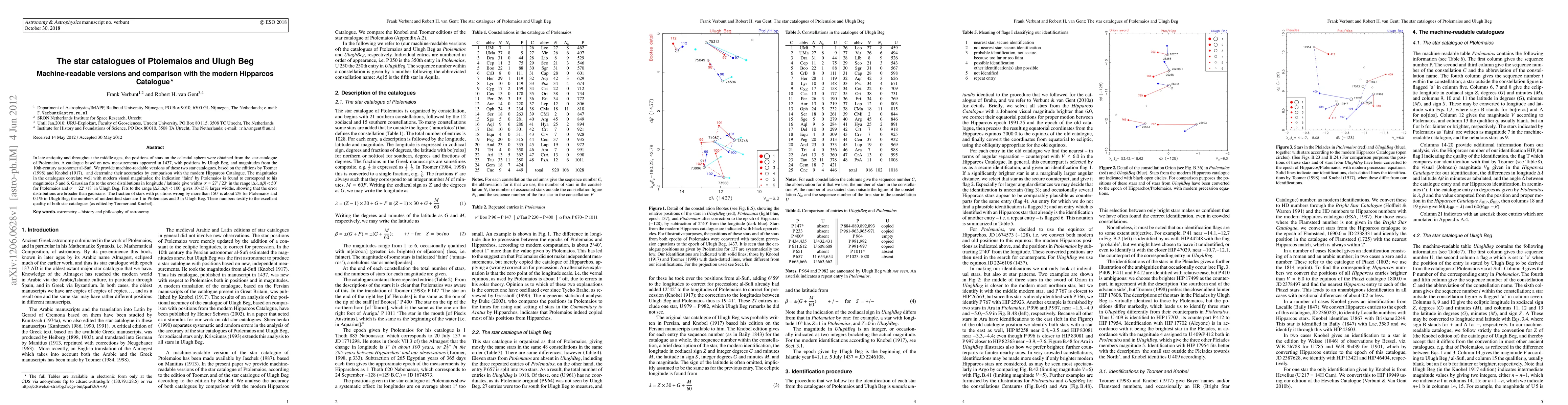 The research used machine-readable versions of Ptolemaios' and Ulugh Beg's star catalogues, which were compared with the modern Hipparcos Catalogue.