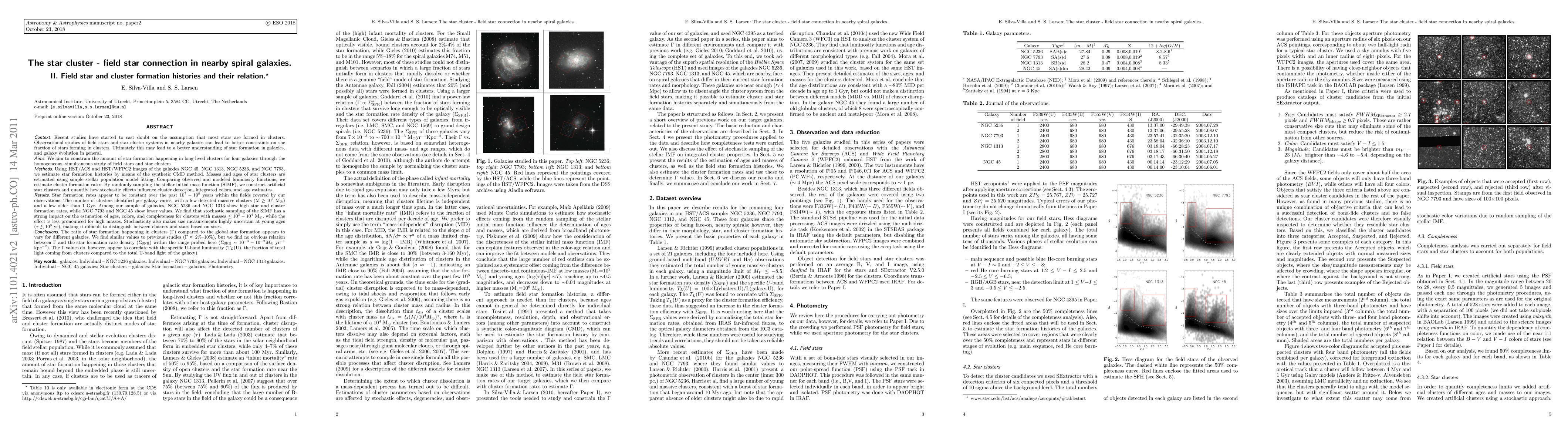 This paper investigates the star formation histories in four nearby spiral galaxies, comparing the formation rates of star clusters and field stars. The study finds that star formation rates have been relatively constant over the past 10-100 Myr, with notable variations in cluster formation rates among the galaxies. Stochastic effects significantly impact the detection and age estimation of low-mass clusters, complicating the distinction between clusters and stars.