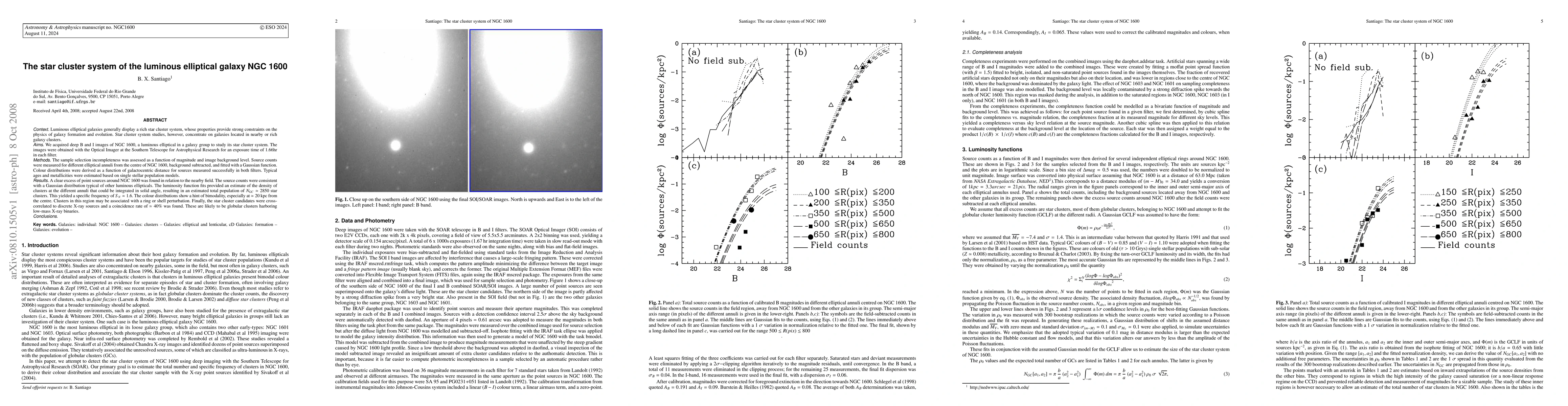 Luminous elliptical galaxies generally display a rich star cluster system, whose properties provide strong constraints on the physics of galaxy formation and evolution. Star cluster system studies, however, concentrate on galaxies located in nearby or rich galaxy clusters. We acquired deep B and I images of NGC 1600, a luminous elliptical in a galaxy group to study its star cluster system. The images were obtained with the Optical Imager at the SOAR telescope. The sample selection incompleteness was assessed as a function of magnitude and image background level. Source counts were measured for different elliptical annuli from the centre of NGC 1600, background subtracted, and fitted with a Gaussian function. Colour distributions were derived as a function of galactocentric distance for sources measured successfully in both filters. Typical ages and metallicities were estimated based on single stellar population models. A clear excess of point sources around NGC 1600 was found in relation to the nearby field. The source counts were consistent with a Gaussian distribution typical of other luminous ellipticals. The luminosity function fits provided an estimate of the density of clusters at the different annuli that could be integrated in solid angle, resulting in an estimated total population of N_{GC} ~ 2850 star clusters. This yielded a specific frequency of S_N ~ 1.6. The colour distributions show a hint of bimodality, especially at ~ 20 kpc from the centre. Clusters in this region may be associated with a ring or shell perturbation. Finally, the star cluster candidates were cross-correlated to discrete X-ray sources and a coincidence rate of ~ 40% was found. These are likely to be globular clusters harboring low-mass X-ray binaries.