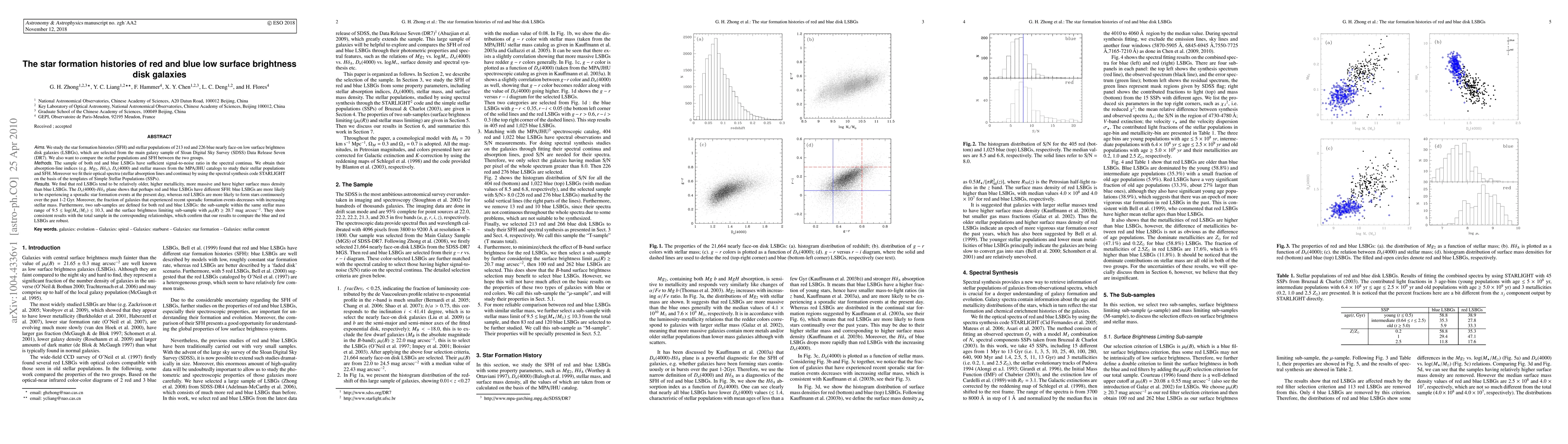 This study investigates the star formation histories and stellar populations of 213 red and 226 blue low surface brightness disk galaxies, finding that red LSBGs are older, more massive, and have continuous star formation over the past 1-2 Gyr, while blue LSBGs likely experience sporadic star formation events today. The results are consistent across defined sub-samples.