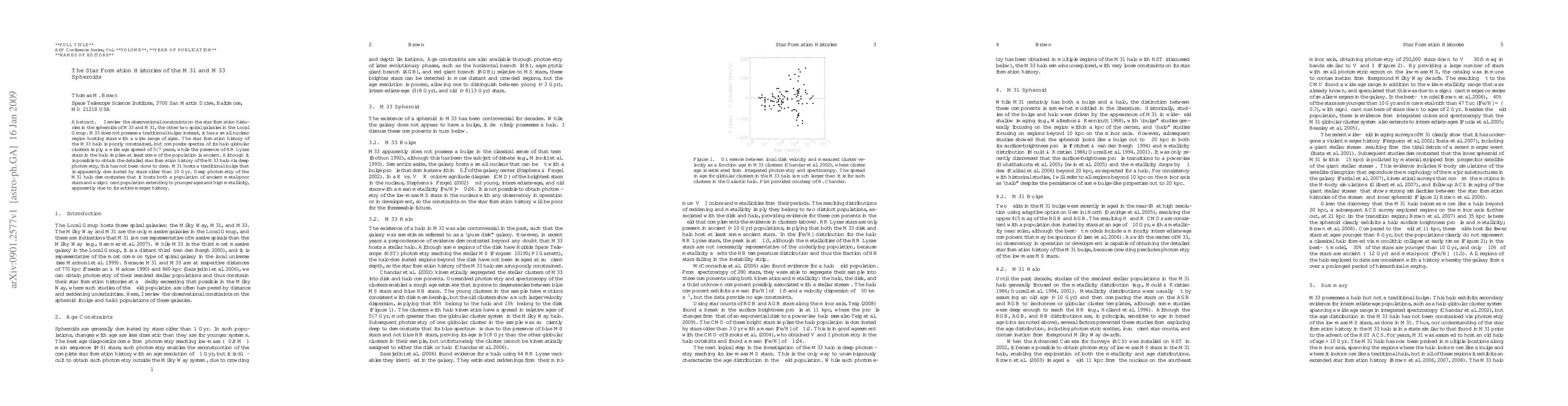 This paper reviews observational data on star formation histories in the spheroids of M31 and M33, revealing M33's small nuclear region with diverse star ages and an ancient RR Lyrae population, while M31's traditional bulge is dominated by older stars, with a younger, metal-rich population likely due to merger activity.