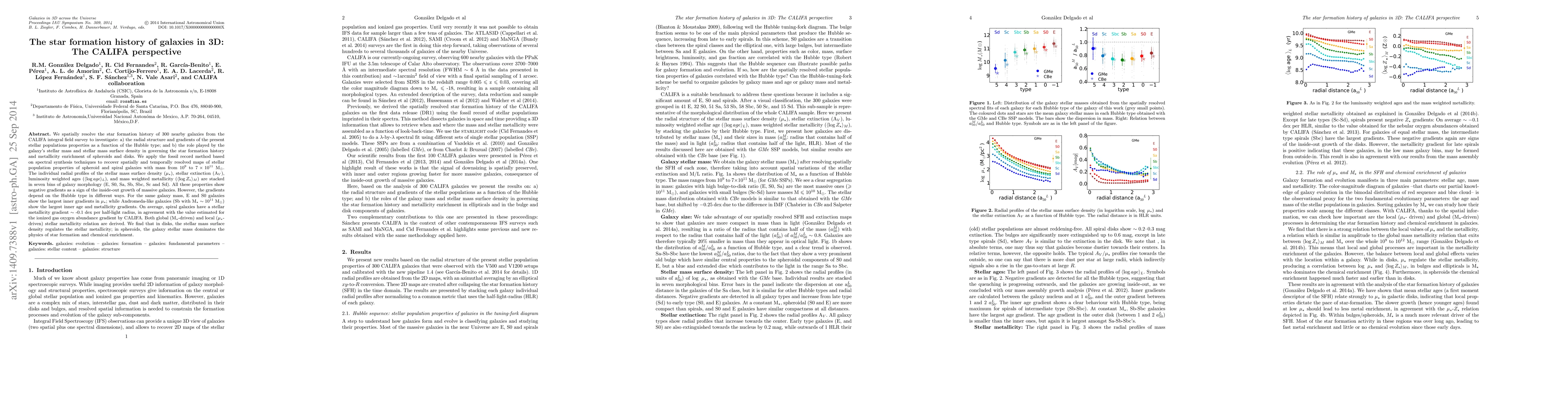 This paper uses the CALIFA survey to spatially resolve the star formation history of 300 nearby galaxies, revealing that massive galaxies exhibit inside-out growth with varying radial gradients dependent on Hubble type. The study shows that stellar mass surface density governs metallicity in disks, while total stellar mass drives star formation and enrichment in spheroids.