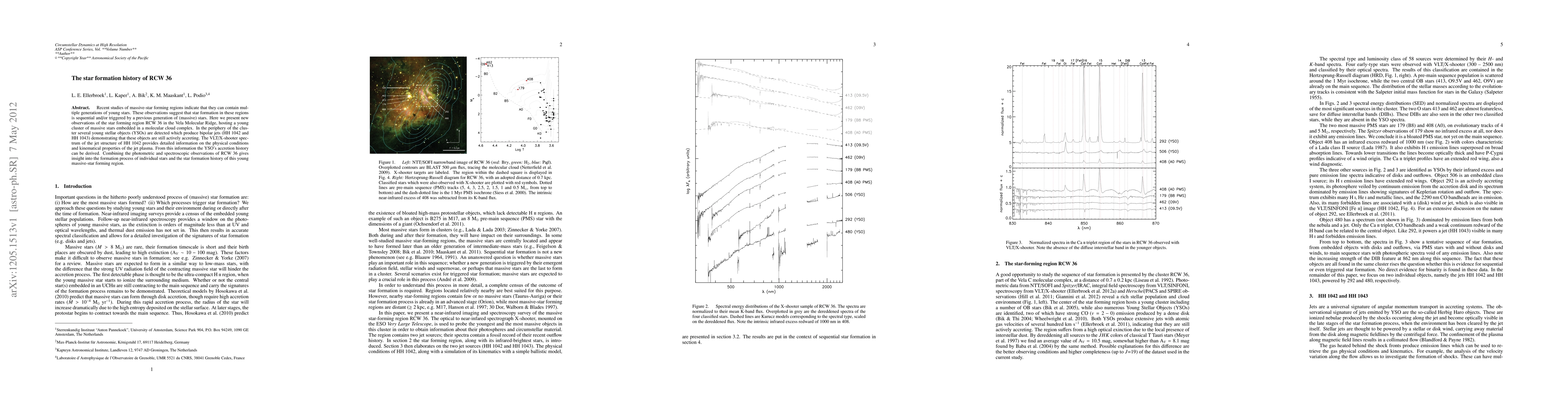 Recent studies of massive-star forming regions indicate that they can contain multiple generations of young stars. These observations suggest that star formation in these regions is sequential and/or triggered by a previous generation of (massive) stars. Here we present new observations of the star forming region RCW 36 in the Vela Molecular Ridge, hosting a young cluster of massive stars embedded in a molecular cloud complex. In the periphery of the cluster several young stellar objects (YSOs) are detected which produce bipolar jets (HH 1042 and HH 1043) demonstrating that these objects are still actively accreting. The VLT/X-shooter spectrum of the jet structure of HH 1042 provides detailed information on the physical conditions and kinematical properties of the jet plasma. From this information the YSO's accretion history can be derived. Combining the photometric and spectroscopic observations of RCW 36 gives insight into the formation process of individual stars and the star formation history of this young massive-star forming region.