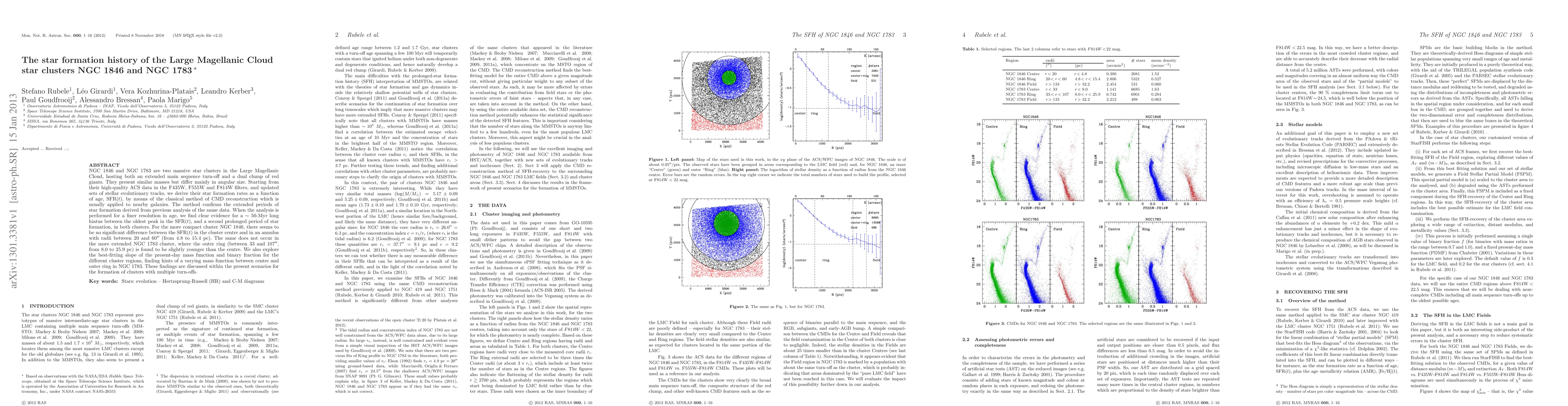 NGC1846 and NGC1783 are two massive star clusters in the Large Magellanic Cloud, hosting both an extended main sequence turn-off and a dual clump of red giants. They present similar masses but differ mainly in angular size. Starting from their high-quality ACS data in the F435W, F555W and F814W filters, and updated sets of stellar evolutionary tracks, we derive their star formation rates as a function of age, SFR(t), by means of the classical method of CMD reconstruction which is usually applied to nearby galaxies. The method confirms the extended periods of star formation derived from previous analysis of the same data. When the analysis is performed for a finer resolution in age, we find clear evidence for a 50-Myr long hiatus between the oldest peak in the SFR(t), and a second prolonged period of star formation, in both clusters. For the more compact cluster NGC1846, there seems to be no significant difference between the SFR(t) in the cluster centre and in an annulus with radii between 20 and 60 arcsec (from 4.8 to 15.4 pc). The same does not occur in the more extended NGC1783 cluster, where the outer ring (between 33 and 107 arcsec, from 8.0 to 25.9 pc) is found to be slightly younger than the centre. We also explore the best-fitting slope of the present-day mass function and binary fraction for the different cluster regions, finding hints of a varying mass function between centre and outer ring in NGC1783. These findings are discussed within the present scenarios for the formation of clusters with multiple turn-offs.