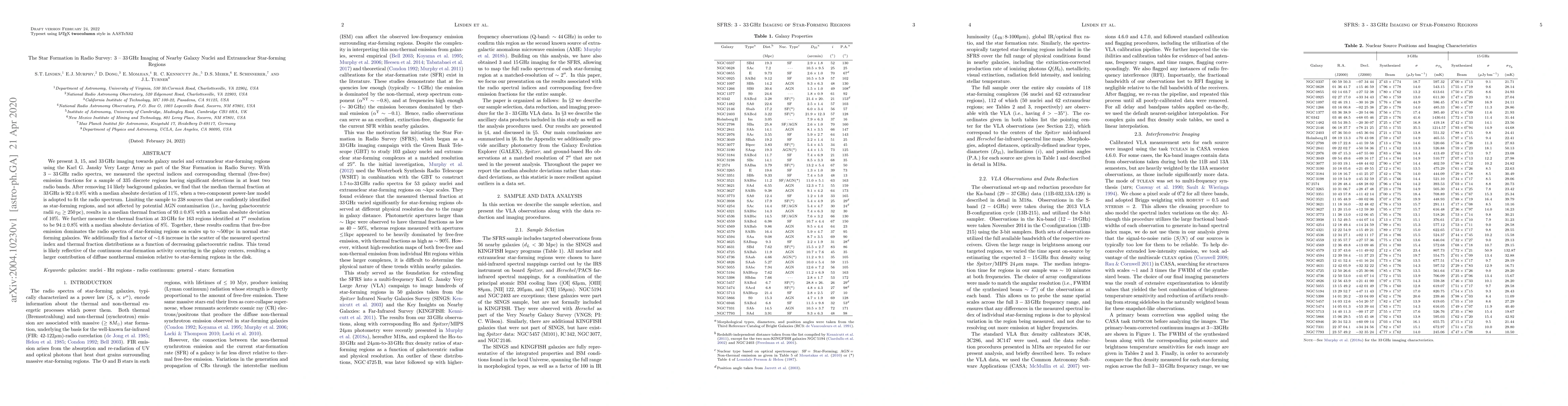The Star Formation in Radio Survey presents 3-33 GHz imaging of nearby galaxy nuclei and star-forming regions using the Very Large Array. They measured spectral indices and thermal emission fractions for 335 regions, finding that free-free emission dominates in star-forming regions up to ~500 pc. The study reveals a scatter increase in spectral index and thermal fraction with decreasing galactocentric radius, indicating continuous star-formation and diffuse nonthermal emission in galaxy centers.