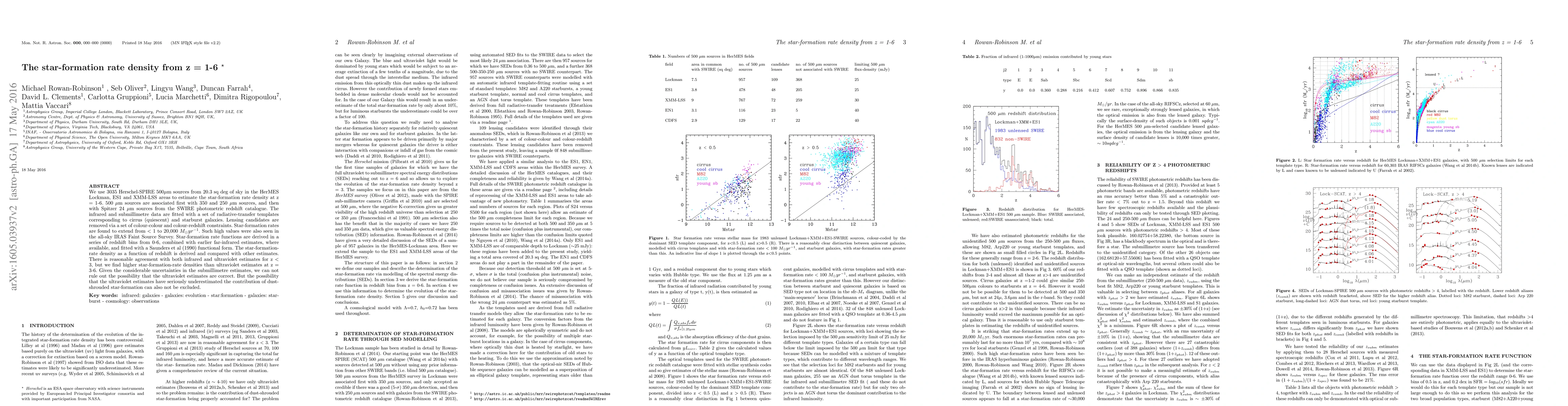 We use 3035 Herschel-SPIRE 500$\mu$m sources from 20.3 sq deg of sky in the HerMES Lockman, ES1 and XMM-LSS areas to estimate the star-formation rate density at z = 1-6. 500 mu sources are associated first with 350 and 250 mu sources, and then with Spitzer 24 mu sources from the SWIRE photometric redshift catalogue. The infrared and submillimetre data are fitted with a set of radiative-transfer templates corresponding to cirrus (quiescent) and starburst galaxies. Lensing candidates are removed via a set of colour-colour and colour-redshift constraints. Star-formation rates are found to extend from < 1 to 20,000 Mo/yr. Such high values were also seen in the all-sky IRAS Faint Source Survey. Star-formation rate functions are derived in a series of redshift bins from 0-6, combined with earlier far-infrared estimates, where available, and fitted with a Saunders et al (1990) functional form. The star-formation-rate density as a function of redshift is derived and compared with other estimates. There is reasonable agreement with both infrared and ultraviolet estimates for z < 3, but we find higher star-formation-rate densities than ultraviolet estimates at z = 3-6. Given the considerable uncertainties in the submillimetre estimates, we can not rule out the possibility that the ultraviolet estimates are correct. But the possibility that the ultraviolet estimates have seriously underestimated the contribution of dust-shrouded star-formation can also not be excluded.