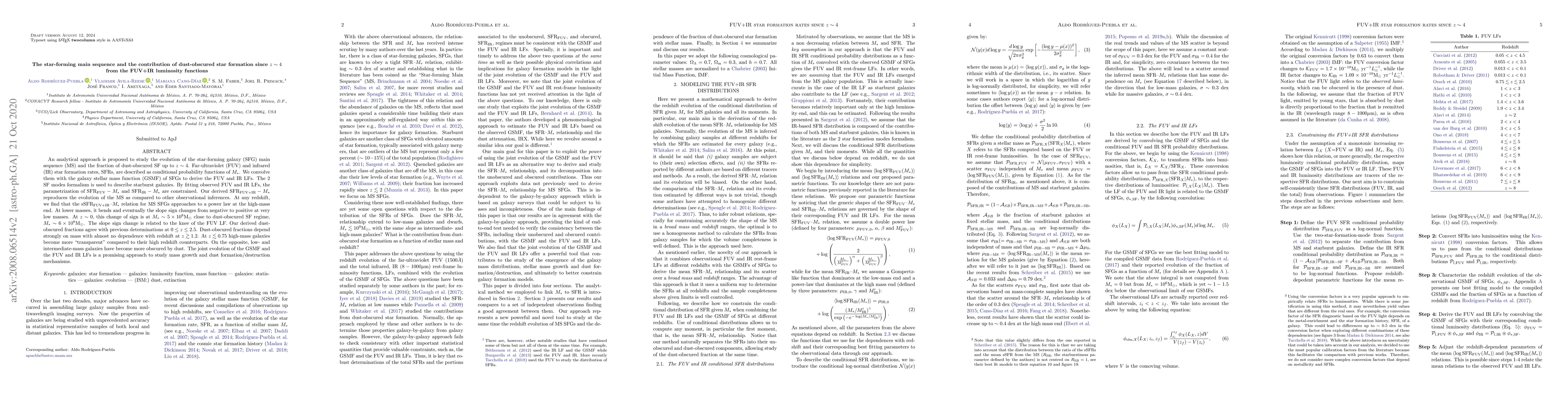 An analytical approach is proposed to study the evolution of the star-forming galaxy (SFG) main sequence (MS) and the fraction of dust-obscured SF up to $z\sim4$. Far-ultraviolet (FUV) and infrared (IR) star formation rates, SFRs, are described as conditional probability functions of $M_{\ast}$. We convolve them with the galaxy stellar mass function (GSMF) of SFGs to derive the FUV and IR LFs. The 2 SF modes formalism is used to describe starburst galaxies. By fitting observed FUV and IR LFs, the parametrization of SFR$_{\rm FUV}-M_{\ast}$ and SFR$_{\rm IR}-M_{\ast}$ are constrained. Our derived SFR$_{\rm FUV+IR}-M_{\ast}$ reproduces the evolution of the MS as compared to other observational inferences. At any redshift, we find that the sSFR$_{\rm FUV+IR}-M_{\ast}$ relation for MS SFGs approaches to a power law at the high-mass end. At lower masses, it bends and eventually the slope sign changes from negative to positive at very low masses. At $z\sim0$, this change of sign is at $M_{\ast}\sim5\times10^{8}{\rm M}_{\odot}$ close to dust-obscured SF regime, $M_{\ast}\sim6\times10^{8}{\rm M}_{\odot}$. The slope sign change is related to the knee of the FUV LF. Our derived dust-obscured fractions agree with previous determinations at $0\leq z\leq2.5$. Dust-obscured fractions depend strongly on mass with almost no dependence with redshift at $z\gtrsim1.2$. At $z\lesssim0.75$ high-mass galaxies become more "transparent" compared to their high redshift counterparts. On the opposite, low- and intermediate-mass galaxies have become more obscured by dust. The joint evolution of the GSMF and the FUV and IR LFs is a promising approach to study mass growth and dust formation/destruction mechanisms.