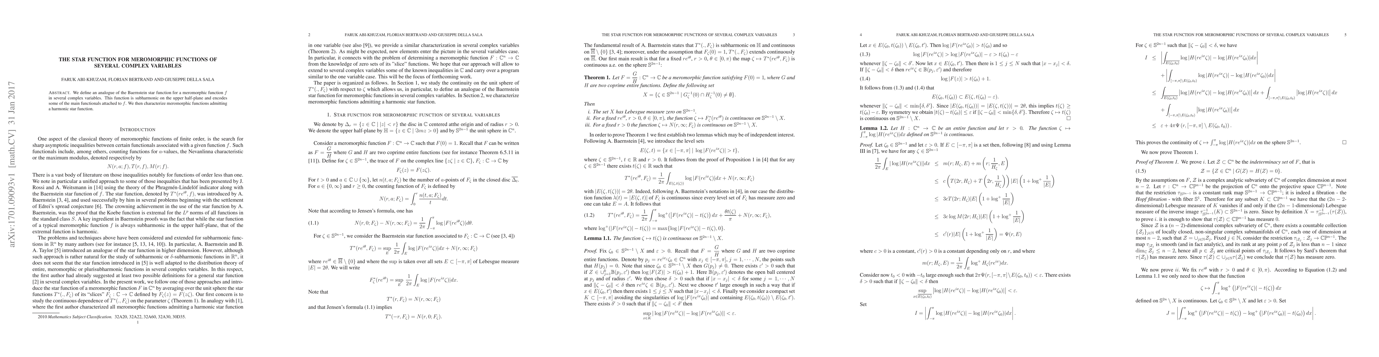 Summary: This paper defines a star function analogue for meromorphic functions in several complex variables, which is subharmonic and encodes key functional properties. It characterizes meromorphic functions that allow for a harmonic star function.