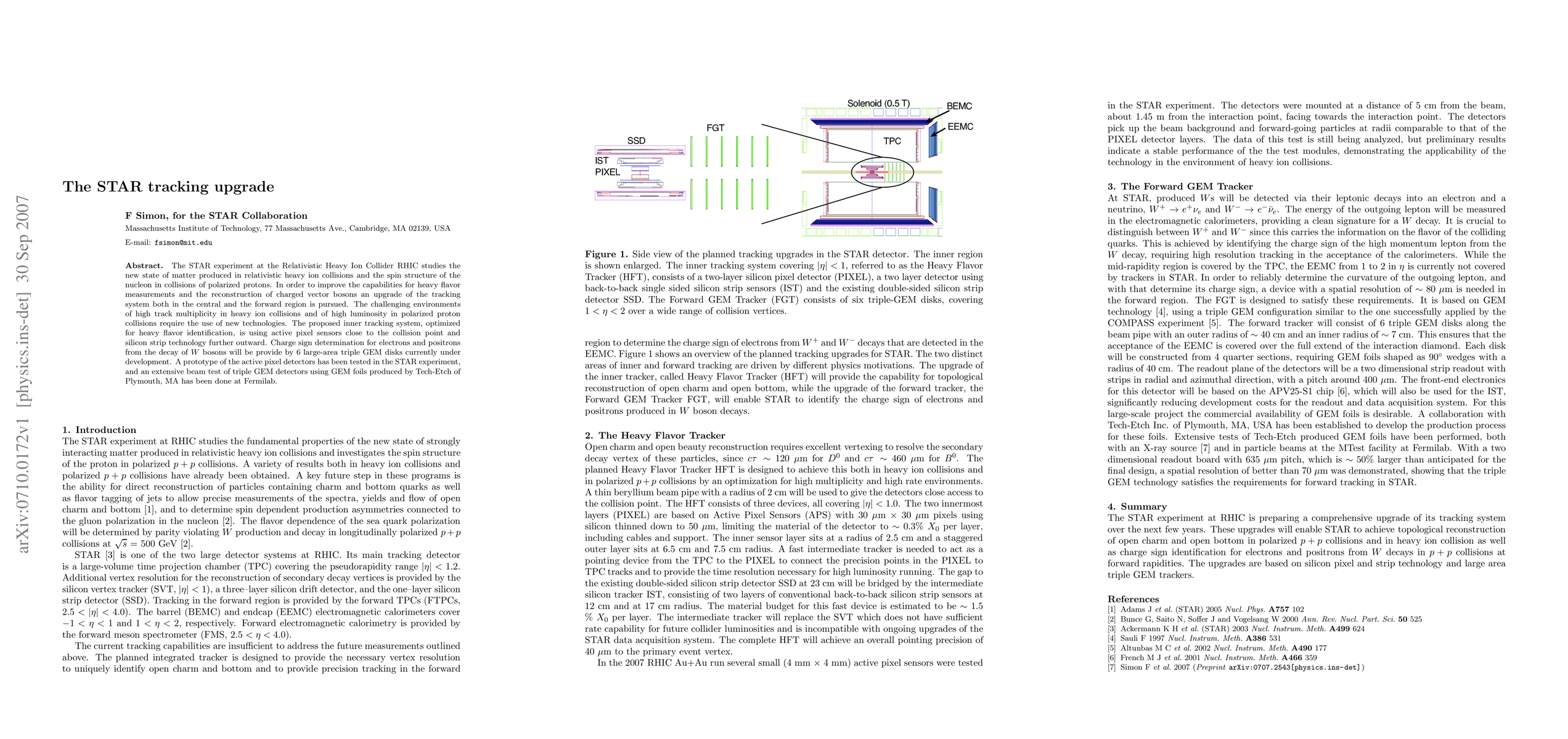 The STAR experiment at the Relativistic Heavy Ion Collider RHIC studies the new state of matter produced in relativistic heavy ion collisions and the spin structure of the nucleon in collisions of polarized protons. In order to improve the capabilities for heavy flavor measurements and the reconstruction of charged vector bosons an upgrade of the tracking system both in the central and the forward region is pursued. The challenging environments of high track multiplicity in heavy ion collisions and of high luminosity in polarized proton collisions require the use of new technologies. The proposed inner tracking system, optimized for heavy flavor identification, is using active pixel sensors close to the collision point and silicon strip technology further outward. Charge sign determination for electrons and positrons from the decay of W bosons will be provide by 6 large-area triple GEM disks currently under development. A prototype of the active pixel detectors has been tested in the STAR experiment, and an extensive beam test of triple GEM detectors using GEM foils produced by Tech-Etch of Plymouth, MA has been done at Fermilab.