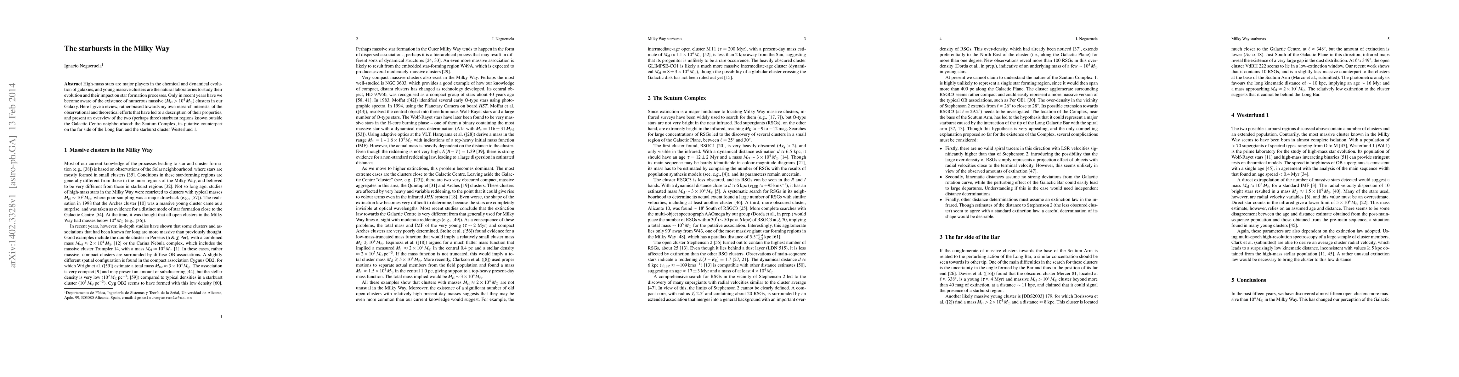 High-mass stars are major players in the chemical and dynamical evolution of galaxies, and young massive clusters are the natural laboratories to study their evolution and their impact on star formation processes. Only in recent years have we become aware of the existence of numerous massive (M_cl > 10000M_sun) clusters in our Galaxy. Here I give a review, rather biased towards my own research interests, of the observational and theoretical efforts that have led to a description of their properties, and present an overview of the two (perhaps three) starburst regions known outside the Galactic Centre neighbourhood: the Scutum Complex, its putative counterpart on the far side of the Long Bar, and the starburst cluster Westerlund 1.