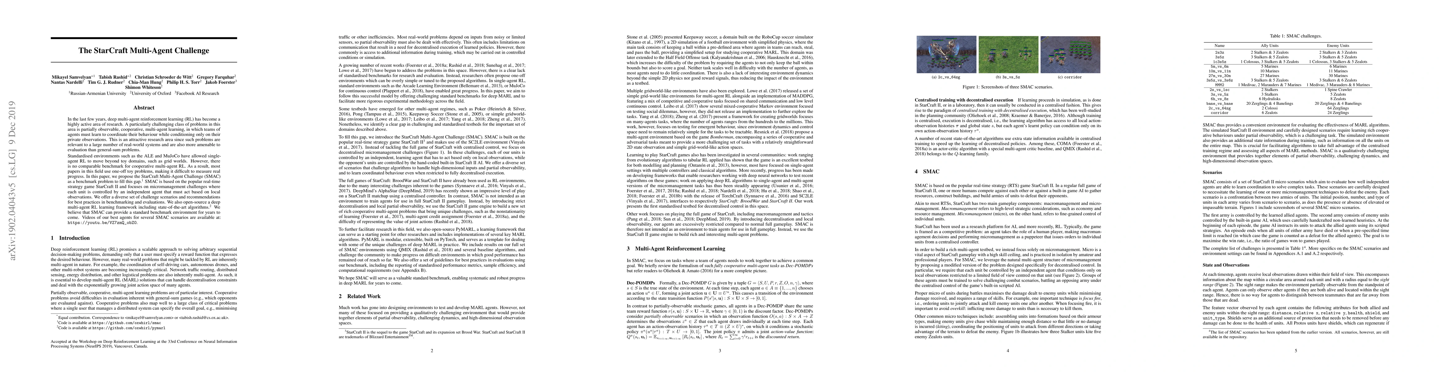 The StarCraft Multi-Agent Challenge (SMAC) is introduced as a benchmark for cooperative multi-agent reinforcement learning, using StarCraft II's micromanagement tasks. It provides diverse maps, best practices, and open-source RL algorithms, aiming to standardize evaluation in this field.