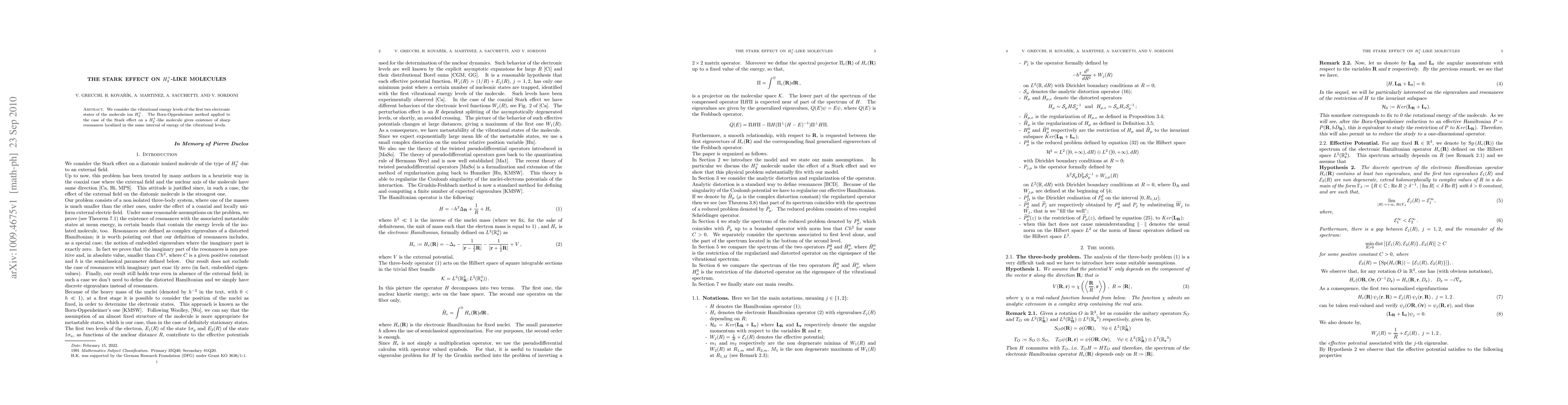 The study analyzes how an external electric field (Stark effect) influences the vibrational energy levels of the $H_2^+$ molecule ion's first two electronic states using the Born-Oppenheimer approximation. It finds that sharp resonances appear, localized within the same energy range as these vibrational levels.