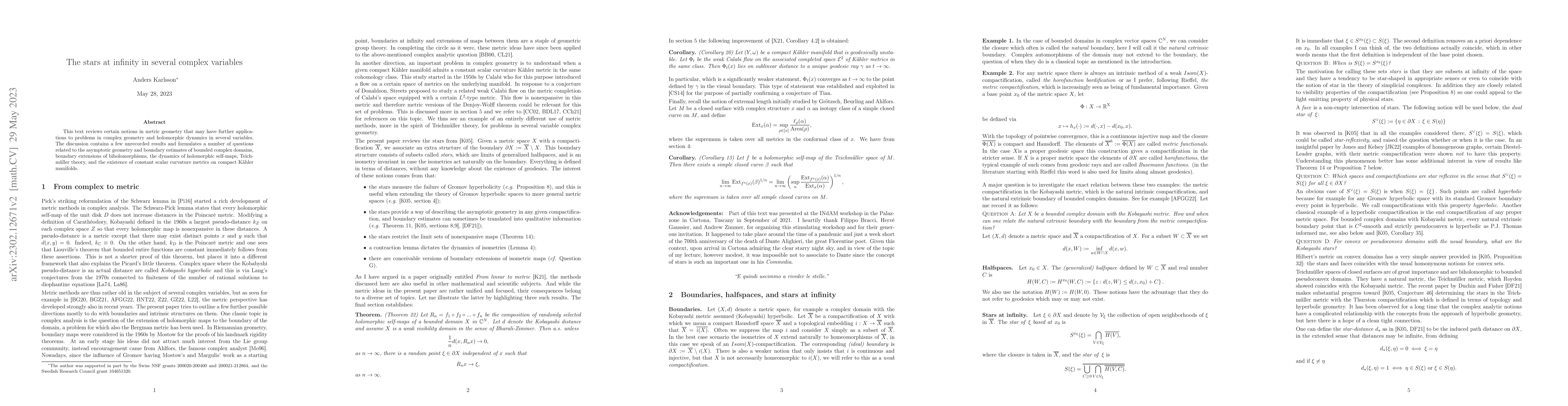 This paper reviews metric geometry concepts with potential applications to complex geometry and holomorphic dynamics in several variables, presenting new results and questions on asymptotic geometry, boundary estimates, and the dynamics of holomorphic self-maps. It also explores Teichmüller theory and the existence of constant scalar curvature metrics on compact Kähler manifolds.
