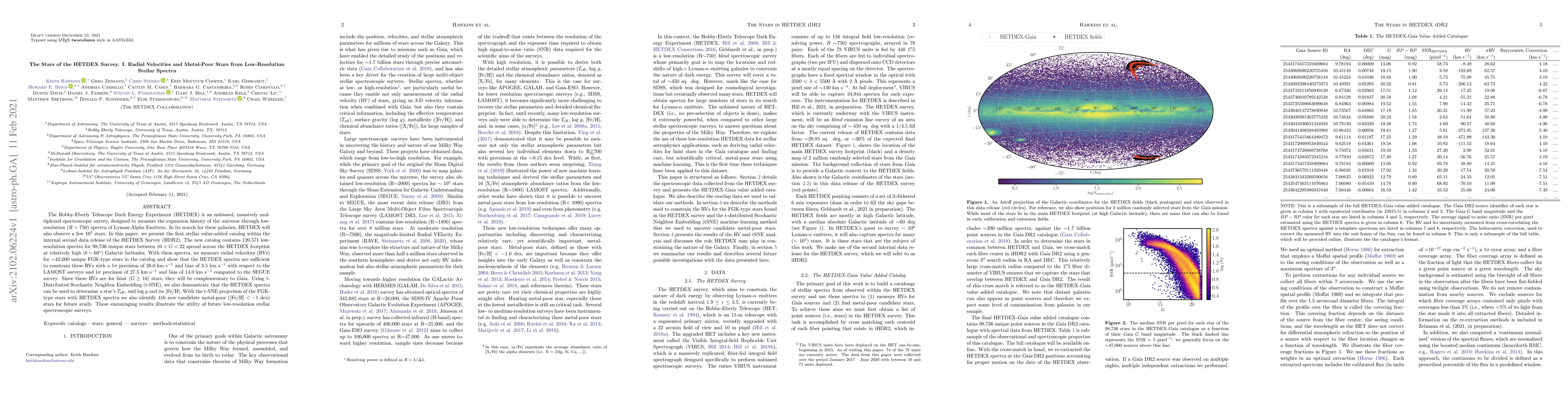 The Hobby-Eberly Telescope Dark Energy Experiment (HETDEX) is an unbiased, massively multiplexed spectroscopic survey, designed to measure the expansion history of the universe through low-resolution ($R\sim750$) spectra of Lyman-Alpha Emitters. In its search for these galaxies, HETDEX will also observe a few 10$^{5}$ stars. In this paper, we present the first stellar value-added catalog within the internal second data release of the HETDEX Survey (HDR2). The new catalog contains 120,571 low-resolution spectra for 98,736 unique stars between $10 < G < 22$ spread across the HETDEX footprint at relatively high ($b\sim60^\circ$) Galactic latitudes. With these spectra, we measure radial velocities (RVs) for $\sim$42,000 unique FGK-type stars in the catalog and show that the HETDEX spectra are sufficient to constrain these RVs with a 1$\sigma$ precision of 28.0 km/s and bias of 3.5 km/s with respect to the LAMOST surveys and 1$\sigma$ precision of 27.5 km/s and bias of 14.0 km/s compared to the SEGUE survey. Since these RVs are for faint ($G\geq16$) stars, they will be complementary to Gaia. Using t-Distributed Stochastic Neighbor Embedding (t-SNE), we also demonstrate that the HETDEX spectra can be used to determine a star's T${\rm{eff}}$, and log g and its [Fe/H]. With the t-SNE projection of the FGK-type stars with HETDEX spectra we also identify 416 new candidate metal-poor ([Fe/H] $< -1$~dex) stars for future study. These encouraging results illustrate the utility of future low-resolution stellar spectroscopic surveys.