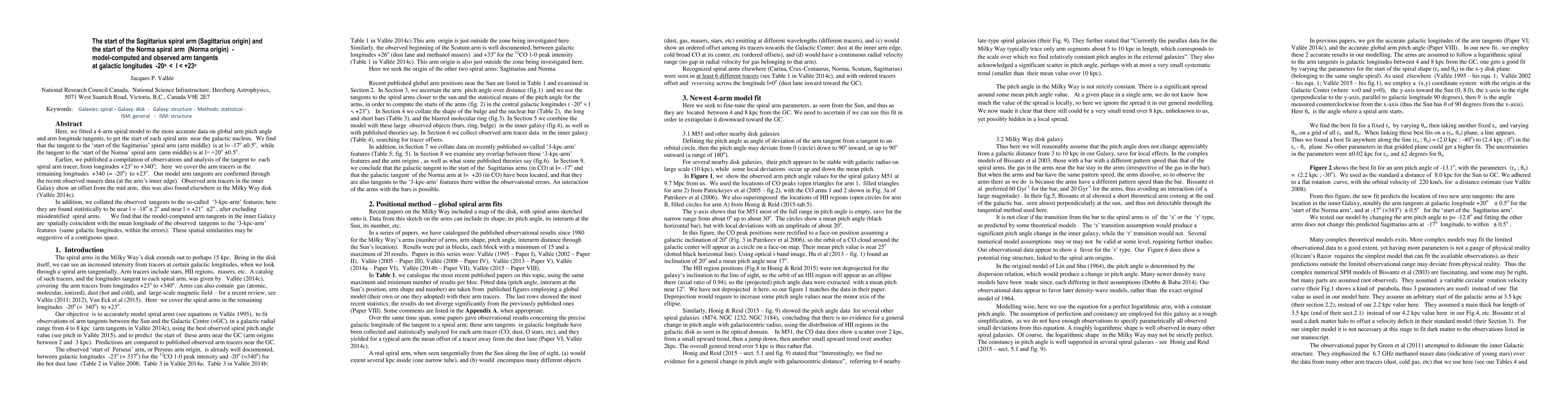 This research paper fits a 4-arm spiral structure to data to determine the tangents marking the start of the Sagittarius and Norma spiral arms near the Galactic nucleus, finding them at l= -17 degrees and l= +20 degrees respectively. The study confirms these model tangents with recent observed masers data and finds spatial coincidence between the model and observed '3-kpc-arm' features.