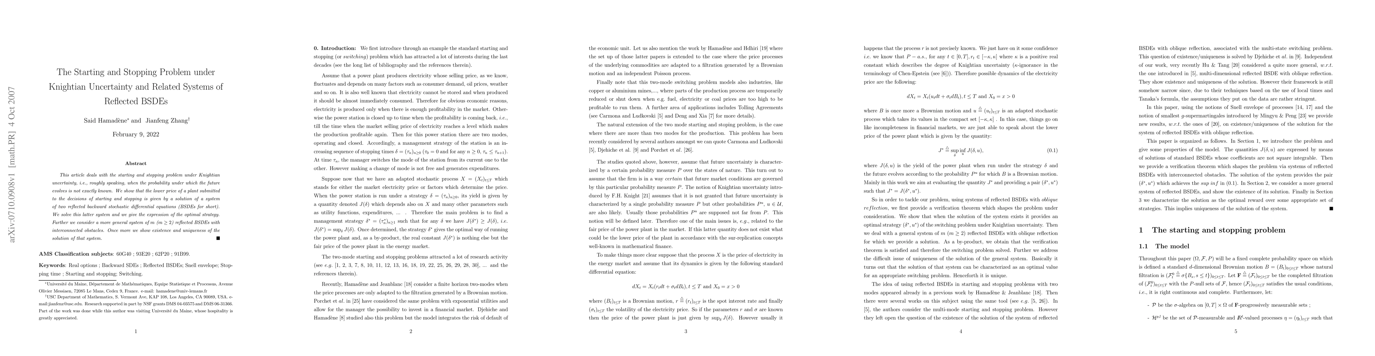 This paper addresses the starting and stopping problem under Knightian uncertainty, where future probabilities are unknown. It demonstrates that the lower price of a plant under such decisions is determined by a system of reflected backward stochastic differential equations (BSDEs). The paper solves this system and provides the optimal strategy, and extends the analysis to a more general system of $m$ reflected BSDEs.