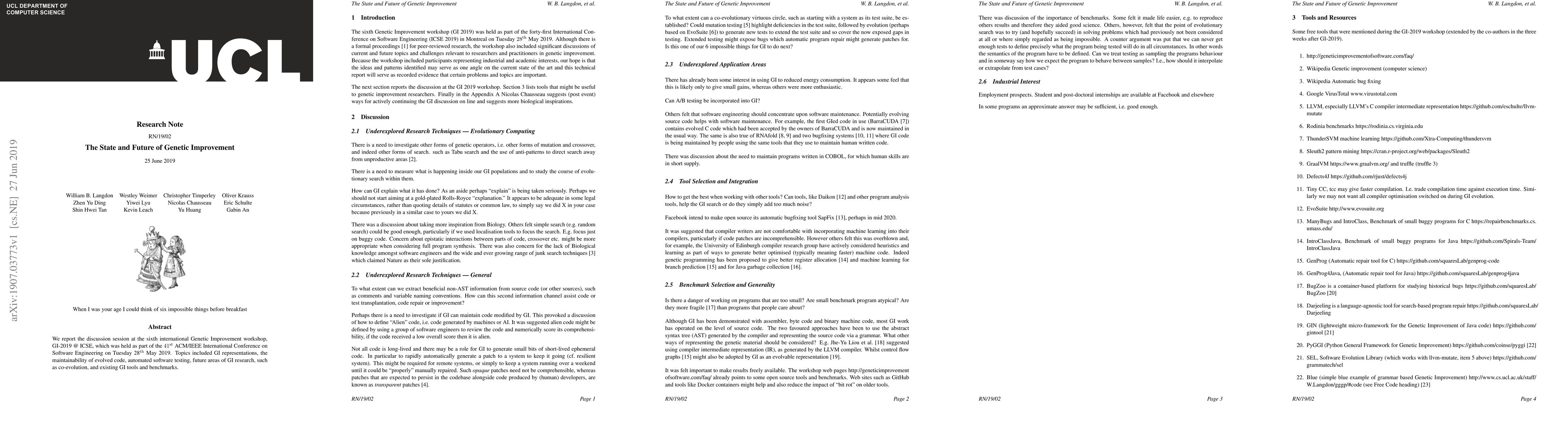 We report the discussion session at the sixth international Genetic Improvement workshop, GI-2019 @ ICSE, which was held as part of the 41st ACM/IEEE International Conference on Software Engineering on Tuesday 28th May 2019. Topics included GI representations, the maintainability of evolved code, automated software testing, future areas of GI research, such as co-evolution, and existing GI tools and benchmarks.