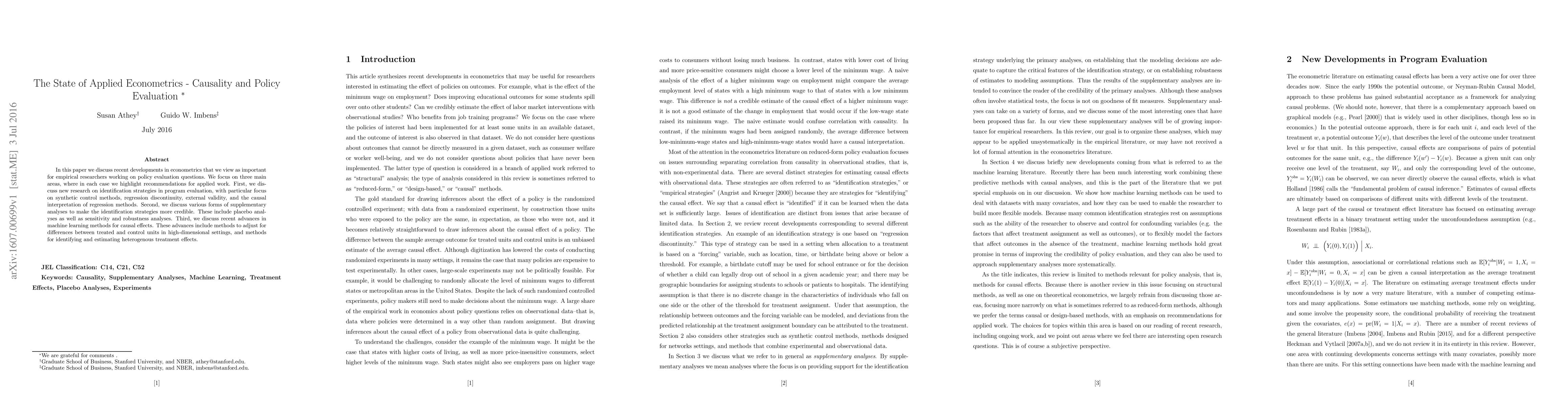 In this paper we discuss recent developments in econometrics that we view as important for empirical researchers working on policy evaluation questions. We focus on three main areas, where in each case we highlight recommendations for applied work. First, we discuss new research on identification strategies in program evaluation, with particular focus on synthetic control methods, regression discontinuity, external validity, and the causal interpretation of regression methods. Second, we discuss various forms of supplementary analyses to make the identification strategies more credible. These include placebo analyses as well as sensitivity and robustness analyses. Third, we discuss recent advances in machine learning methods for causal effects. These advances include methods to adjust for differences between treated and control units in high-dimensional settings, and methods for identifying and estimating heterogeneous treatment effects.
