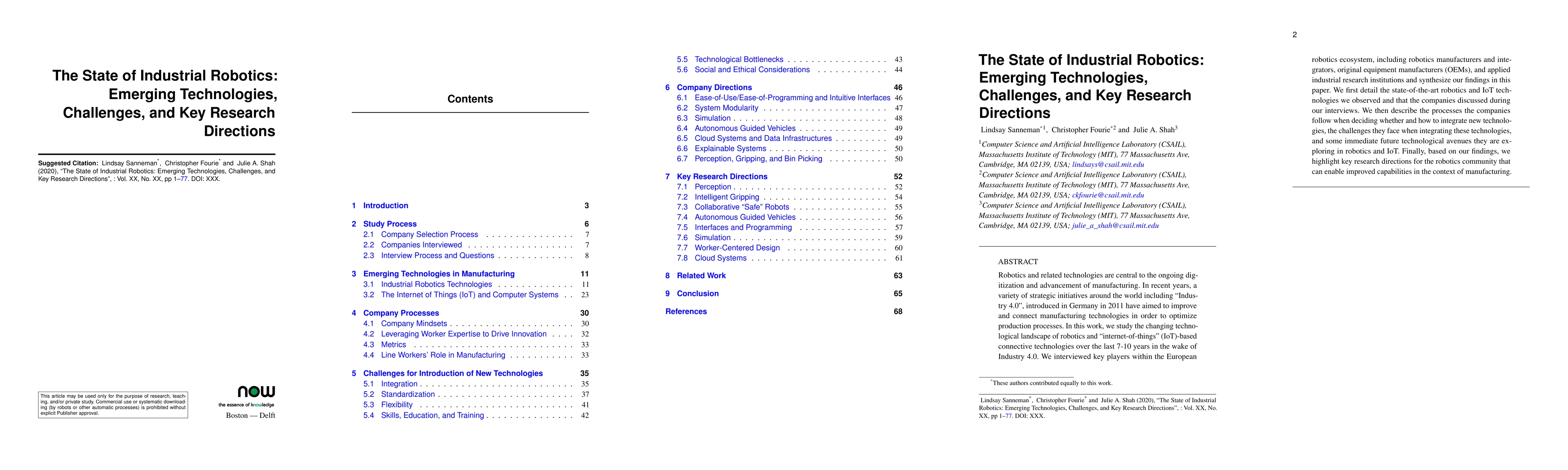 Robotics and related technologies are central to the ongoing digitization and advancement of manufacturing. In recent years, a variety of strategic initiatives around the world including "Industry 4.0", introduced in Germany in 2011 have aimed to improve and connect manufacturing technologies in order to optimize production processes. In this work, we study the changing technological landscape of robotics and "internet-of-things" (IoT)-based connective technologies over the last 7-10 years in the wake of Industry 4.0. We interviewed key players within the European robotics ecosystem, including robotics manufacturers and integrators, original equipment manufacturers (OEMs), and applied industrial research institutions and synthesize our findings in this paper. We first detail the state-of-the-art robotics and IoT technologies we observed and that the companies discussed during our interviews. We then describe the processes the companies follow when deciding whether and how to integrate new technologies, the challenges they face when integrating these technologies, and some immediate future technological avenues they are exploring in robotics and IoT. Finally, based on our findings, we highlight key research directions for the robotics community that can enable improved capabilities in the context of manufacturing.