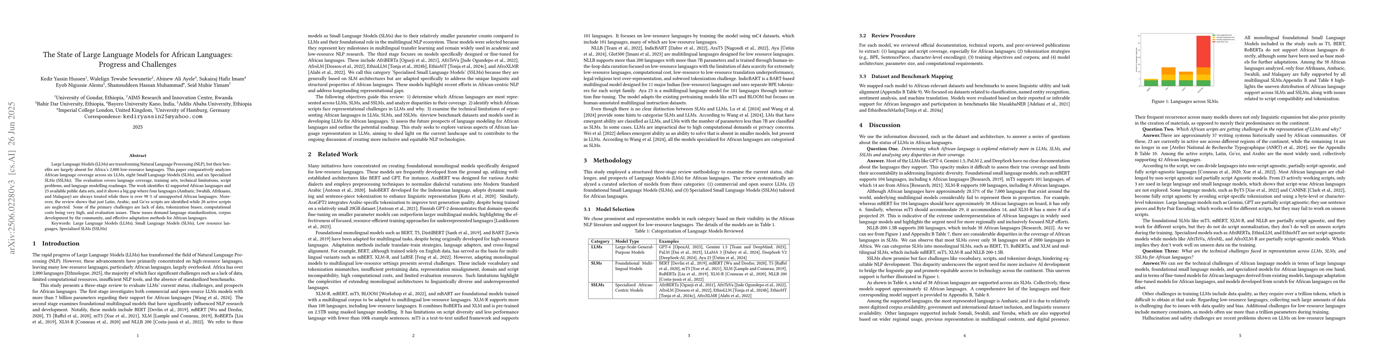 The paper comparatively analyzes coverage of African languages across six LLMs, eight SLMs, and six SSLMs, evaluating language coverage, training sets, technical limitations, script problems, and language modelling roadmaps.