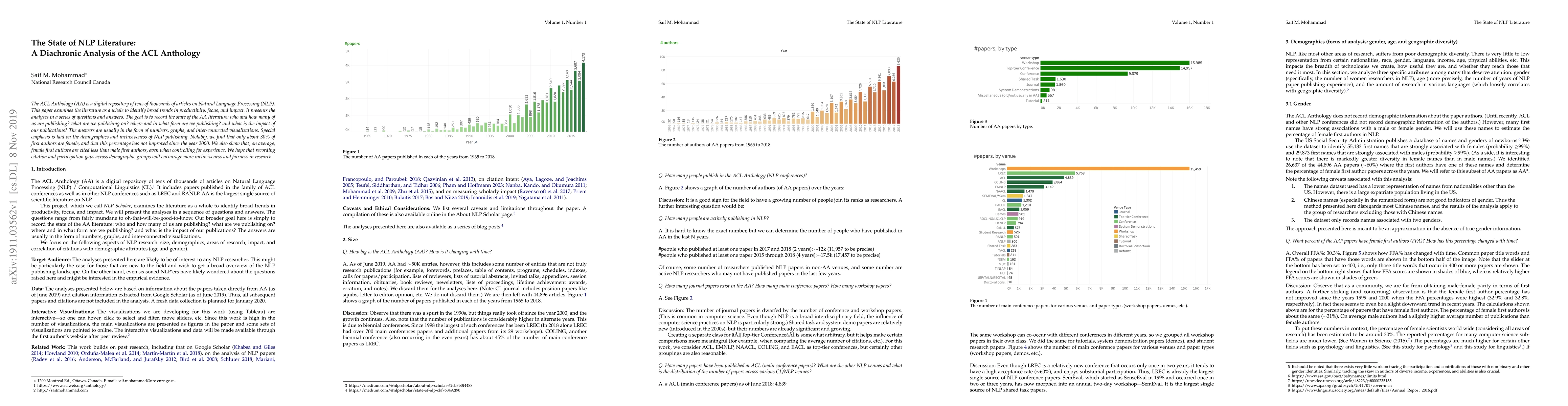 This paper conducts a diachronic analysis of the ACL Anthology to identify trends in NLP literature, focusing on productivity, focus, and impact. It highlights significant gender disparities, noting that only 30% of first authors are female, with these authors receiving fewer citations, suggesting a need for greater inclusiveness in NLP research.