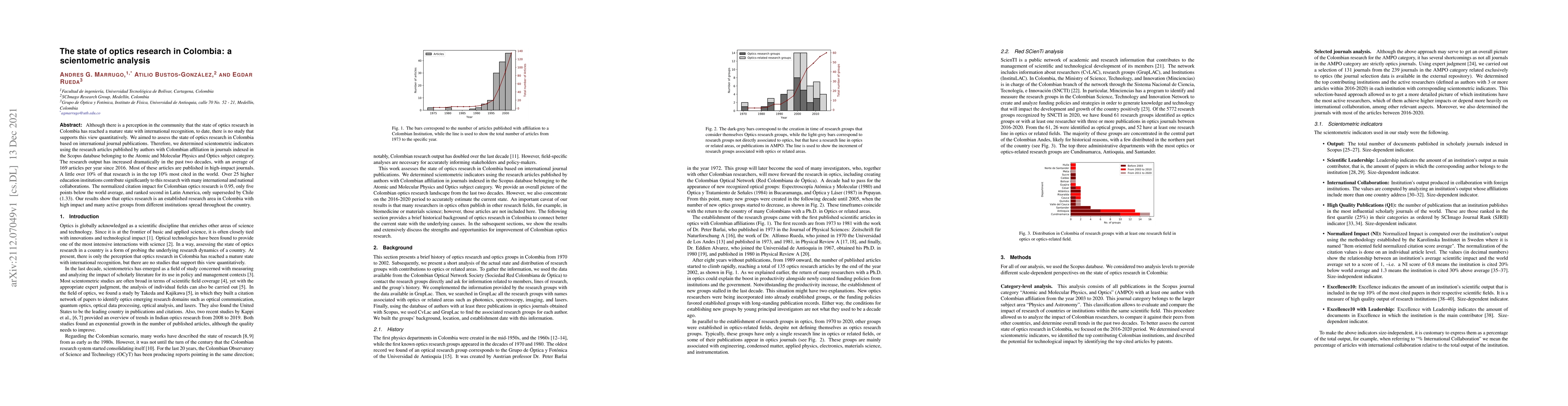 This study quantitatively assesses the state of optics research in Colombia, revealing a significant increase in publication output and high-impact publications, with over 25 institutions contributing and international collaborations. Colombian optics research ranks second in Latin America with a normalized citation impact close to the global average.
