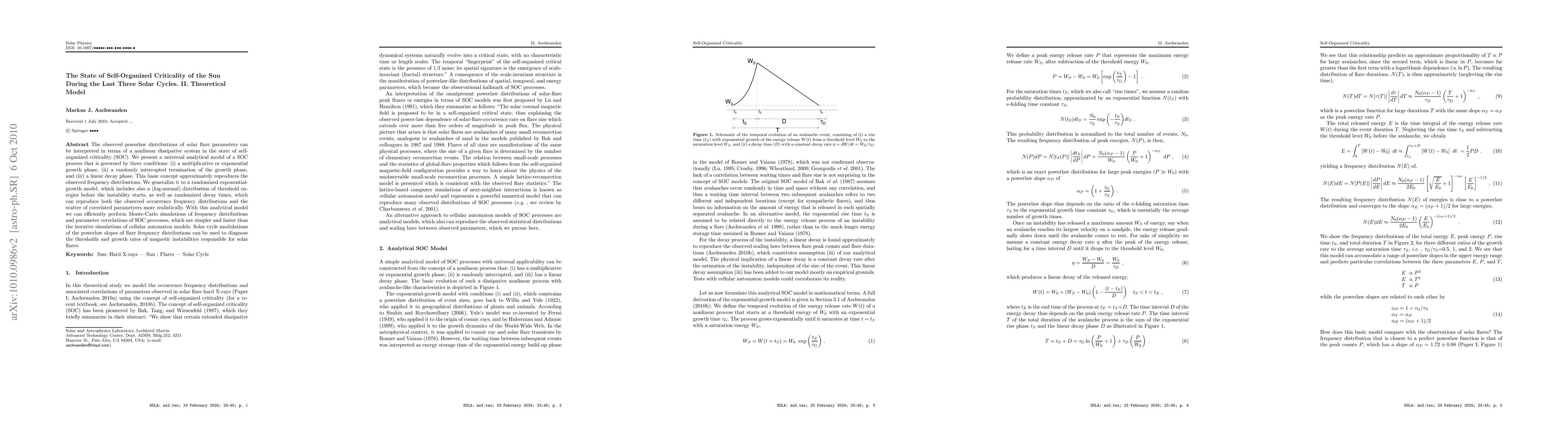 The paper introduces a theoretical model explaining solar flare parameters' powerlaw distributions through self-organized criticality. The model, involving exponential growth, random interruptions, and linear decay, is enhanced with log-normal threshold energy and decay time variations. This model simplifies Monte-Carlo simulations for frequency distributions and parameter correlations, offering a tool for diagnosing solar flare thresholds and growth rates across solar cycles.