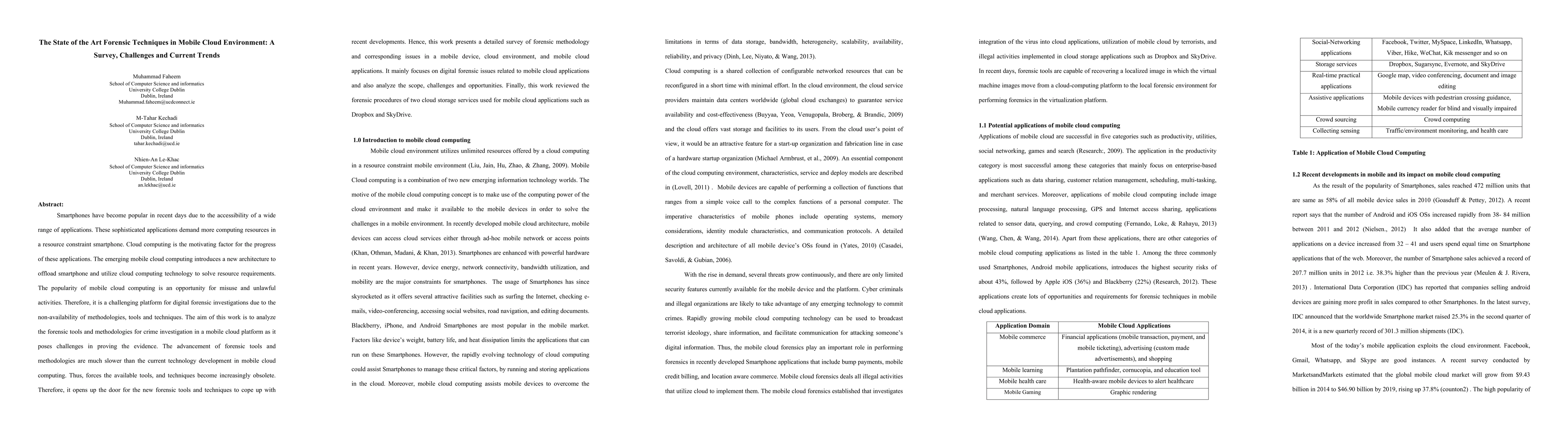 This paper surveys current forensic techniques for mobile cloud environments, highlighting the challenges and opportunities in digital forensic investigations due to the rapid development of mobile cloud computing. It emphasizes the need for updated methodologies and tools to address the evolving landscape of mobile cloud applications.