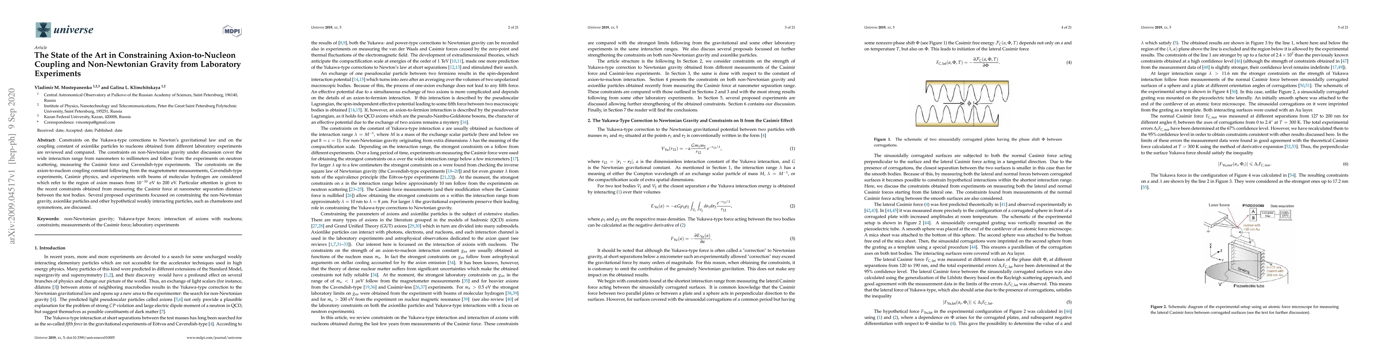 This paper reviews and compares constraints on non-Newtonian gravity and axion-to-nucleon coupling obtained from various laboratory experiments, including neutron scattering and Casimir force measurements. It highlights recent stringent limits from nanometer-scale Casimir force experiments and discusses future experimental proposals.