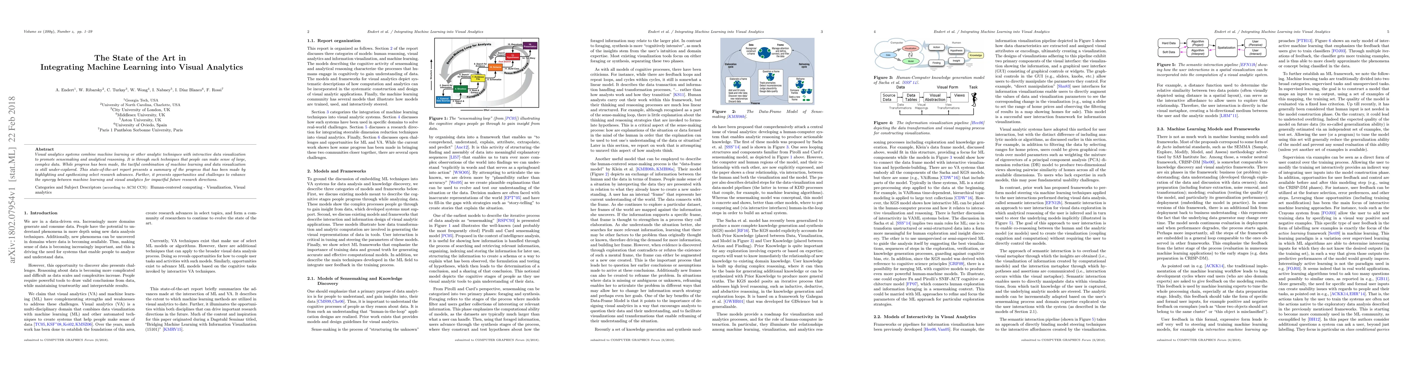 Visual analytics systems combine machine learning or other analytic techniques with interactive data visualization to promote sensemaking and analytical reasoning. It is through such techniques that people can make sense of large, complex data. While progress has been made, the tactful combination of machine learning and data visualization is still under-explored. This state-of-the-art report presents a summary of the progress that has been made by highlighting and synthesizing select research advances. Further, it presents opportunities and challenges to enhance the synergy between machine learning and visual analytics for impactful future research directions.