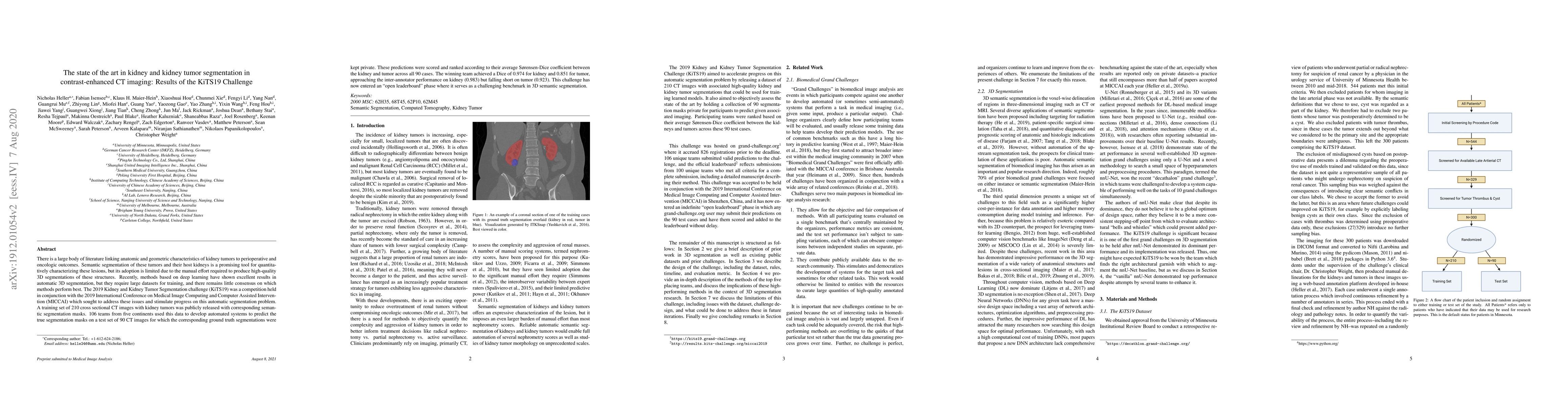 The KiTS19 Challenge aimed to advance automatic kidney and tumor segmentation in contrast-enhanced CT imaging using deep learning. The competition resulted in high-performing models, with the best achieving a Dice coefficient of 0.974 for kidneys and 0.851 for tumors, though still below inter-annotator agreement.
