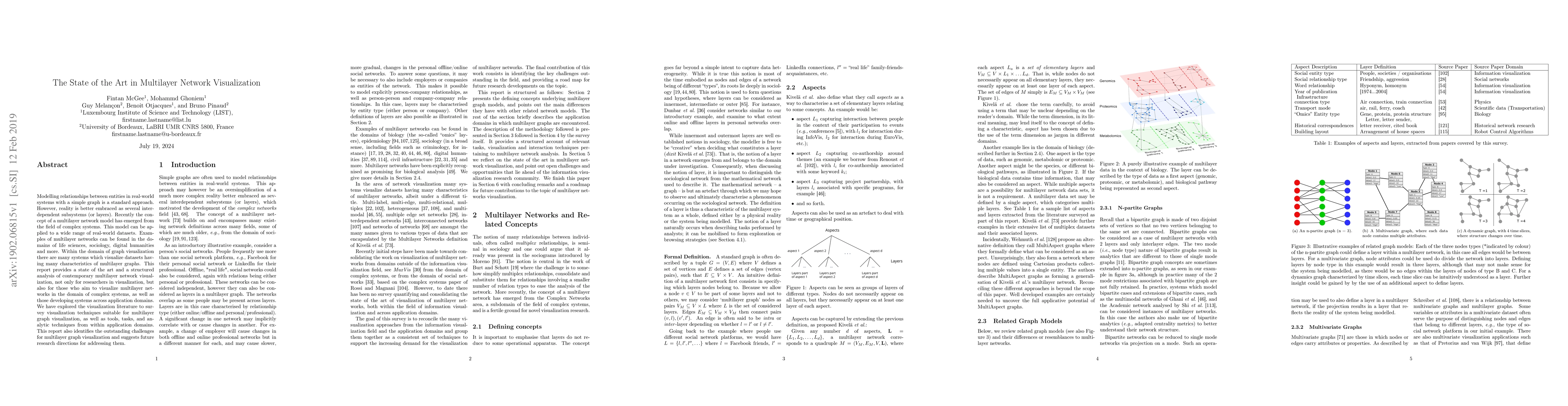 Modelling relationships between entities in real-world systems with a simple graph is a standard approach. However, reality is better embraced as several interdependent subsystems (or layers). Recently the concept of a multilayer network model has emerged from the field of complex systems. This model can be applied to a wide range of real-world datasets. Examples of multilayer networks can be found in the domains of life sciences, sociology, digital humanities and more. Within the domain of graph visualization there are many systems which visualize datasets having many characteristics of multilayer graphs. This report provides a state of the art and a structured analysis of contemporary multilayer network visualization, not only for researchers in visualization, but also for those who aim to visualize multilayer networks in the domain of complex systems, as well as those developing systems across application domains. We have explored the visualization literature to survey visualization techniques suitable for multilayer graph visualization, as well as tools, tasks, and analytic techniques from within application domains. This report also identifies the outstanding challenges for multilayer graph visualization and suggests future research directions for addressing them.