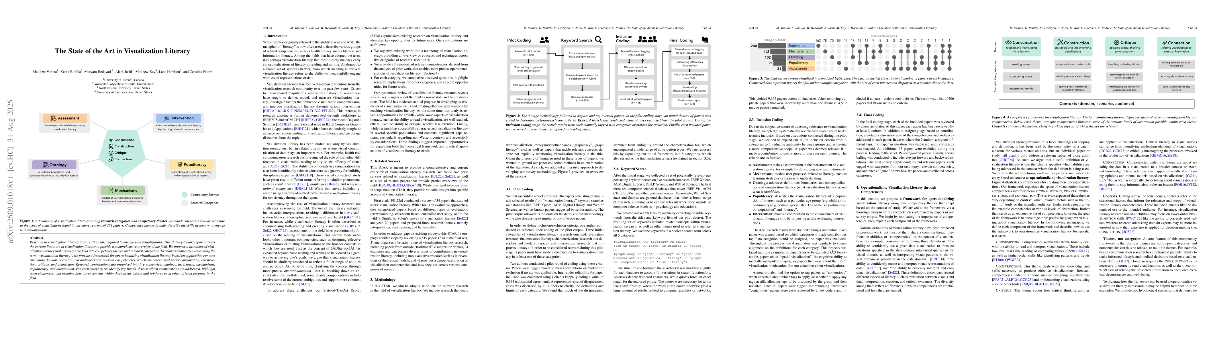 Research in visualization literacy explores the skills required to engage with visualizations. This state-of-the-art report surveys the current literature in visualization literacy to provide a comprehensive overview of the field. We propose a taxonomy of visualization literacy that organizes the field into competency themes and research categories. To address ambiguity surrounding the term ``visualization literacy'', we provide a framework for operationalizing visualization literacy based on application contexts (including domain, scenario, and audience) and relevant competencies, which are categorized under consumption, construction, critique, and connection. Research contributions are organized into five categories: ontology, assessment, mechanisms, populiteracy, and intervention. For each category, we identify key trends, discuss which competencies are addressed, highlight open challenges, and examine how advancements within these areas inform and reinforce each other, driving progress in the field.