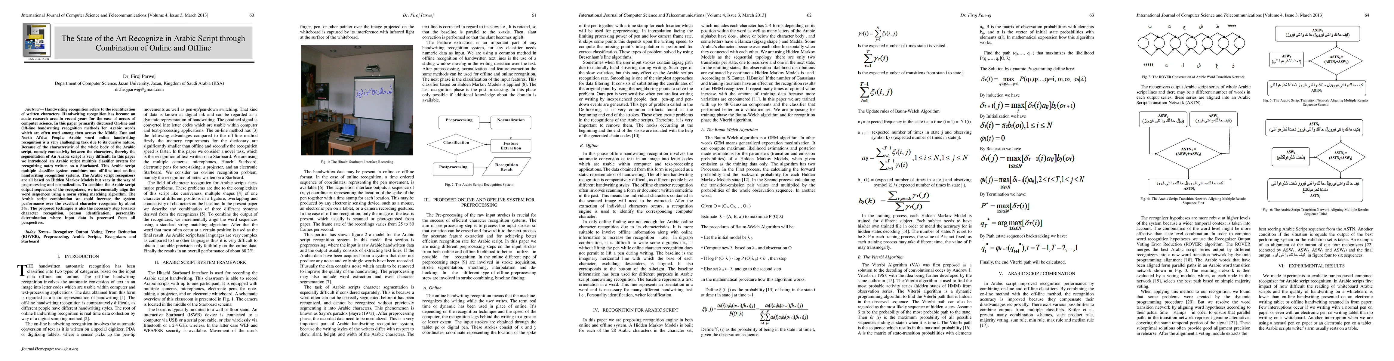 This paper explores a hybrid online and offline handwriting recognition system for Arabic script, addressing the cursive nature and segmentation challenges. By combining multiple classifiers based on Hidden Markov Models and using a norm string matching algorithm for sequence alignment, the proposed method improves recognition performance by about 3%.