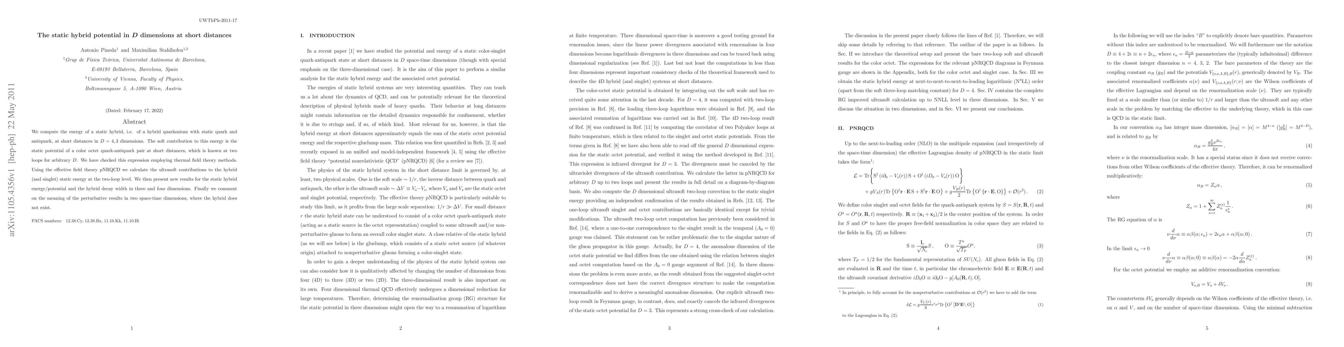 We compute the energy of a static hybrid, i.e. of a hybrid quarkonium with static quark and antiquark, at short distances in D=4,3 dimensions. The soft contribution to this energy is the static potential of a color octet quark-antiquark pair at short distances, which is known at two loops for arbitrary D. We have checked this expression employing thermal field theory methods. Using the effective field theory pNRQCD we calculate the ultrasoft contributions to the hybrid (and singlet) static energy at the two-loop level. We then present new results for the static hybrid energy/potential and the hybrid decay width in three and four dimensions. Finally we comment on the meaning of the perturbative results in two space-time dimensions, where the hybrid does not exist.