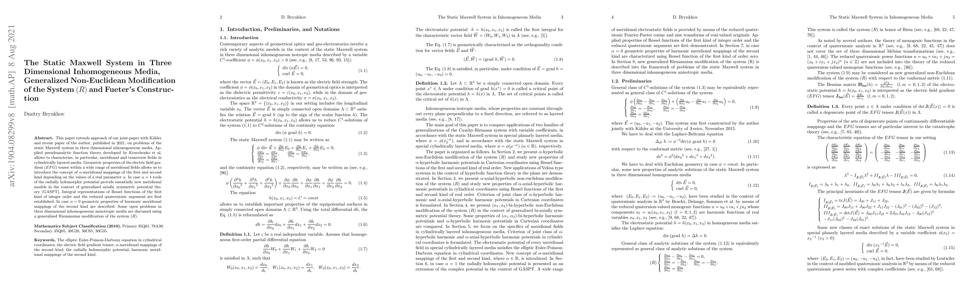 This paper extends approach of our joint paper with K\"{a}hler and recent paper of the author, published in 2021, on problems of the static Maxwell system in three dimensional inhomogeneous media. Applied pseudoanalytic function theory developed by Kravchenko et al. allows to characterize, in particular, meridional and transverse fields in cylindrically layered media. Geometric properties of the electric field gradient ($EFG$) tensor within a wide range of meridional fields allows us to introduce the concept of $\alpha$-meridional mappings of the first and second kind depending on the values of a real parameter $\alpha$. In case $\alpha =1$ tools of the radially holomorphic potential provide essentially new meridional models in the context of generalized axially symmetric potential theory (GASPT). Integral representations of Bessel functions of the first kind of integer order and the reduced quaternionic argument are first established. In case $\alpha =0$ geometric properties of harmonic meridional mappings of the second kind are described. Some open problems in three dimensional inhomogeneous anisotropic media are discussed using a generalized Riemannian modification of the system $(R)$.