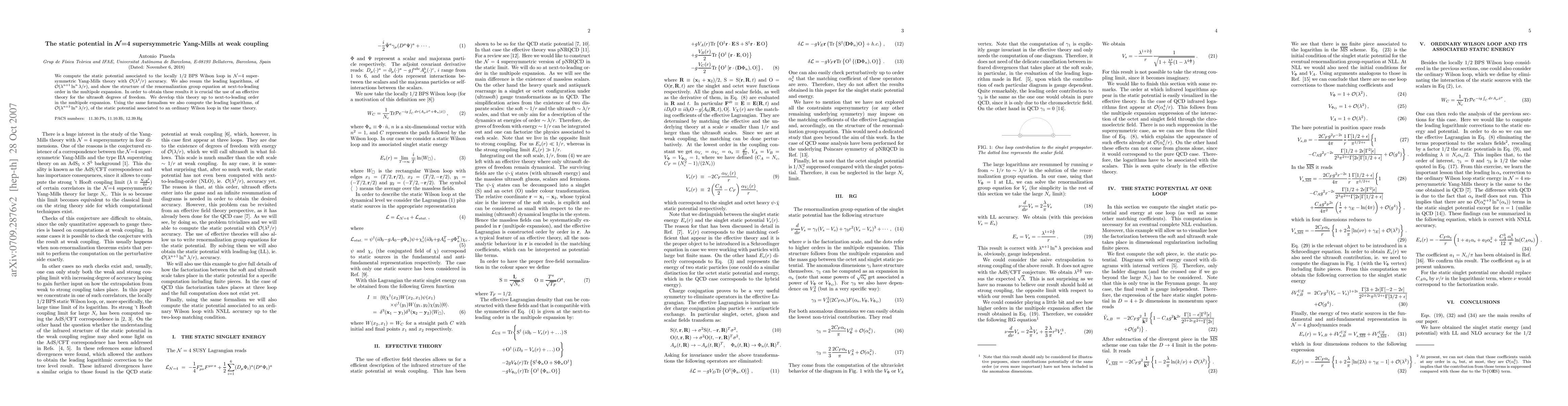This paper computes the static potential in {\cal N}=4 supersymmetric Yang-Mills theory to ${\cal O}(\lambda^2/r)$ accuracy, focusing on the locally 1/2 BPS Wilson loop, and resums leading logarithms. An effective theory for ultrasoft degrees of freedom is developed to achieve these results.
