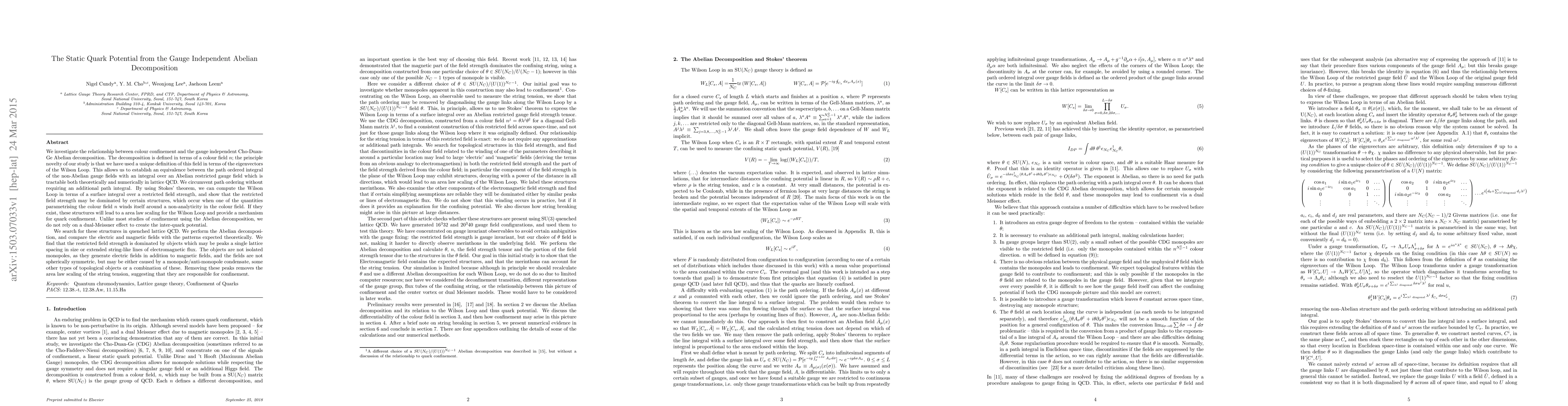 We investigate the relationship between colour confinement and the gauge independent Cho-Duan-Ge Abelian decomposition. The decomposition is defined in terms of a colour field $n$; the principle novelty of our study is that we have defined this field in terms of the eigenvectors of the Wilson Loop. This establishes an equivalence between the path ordered integral of the non-Abelian gauge fields with an integral over an Abelian restricted gauge field which is tractable both theoretically and numerically in lattice QCD. We circumvent path ordering without needing an additional path integral. By using Stokes' theorem, we can compute the Wilson Loop in terms of a surface integral over a restricted field strength, and show that the restricted field strength may be dominated by certain structures, which occur when one of the quantities parametrising the colour field $n$ winds itself around a non-analyticity in the colour field. If they exist, these structures will lead to a area law scaling for the Wilson Loop and provide a mechanism for quark confinement. We search for these structures in quenched lattice QCD. We perform the Abelian decomposition, and compare the electric and magnetic fields with the patterns expected theoretically. We find that the restricted field strength is dominated by objects which may be peaks a single lattice spacing in size or extended string-like lines of electromagnetic flux. The objects are not isolated monopoles, as they generate electric fields in addition to magnetic fields, and the fields are not spherically symmetric, but may be either caused by a monopole/anti-monopole condensate, some other types of topological objects or a combination of these. Removing these peaks removes the area law scaling of the string tension, suggesting that they are responsible for confinement.