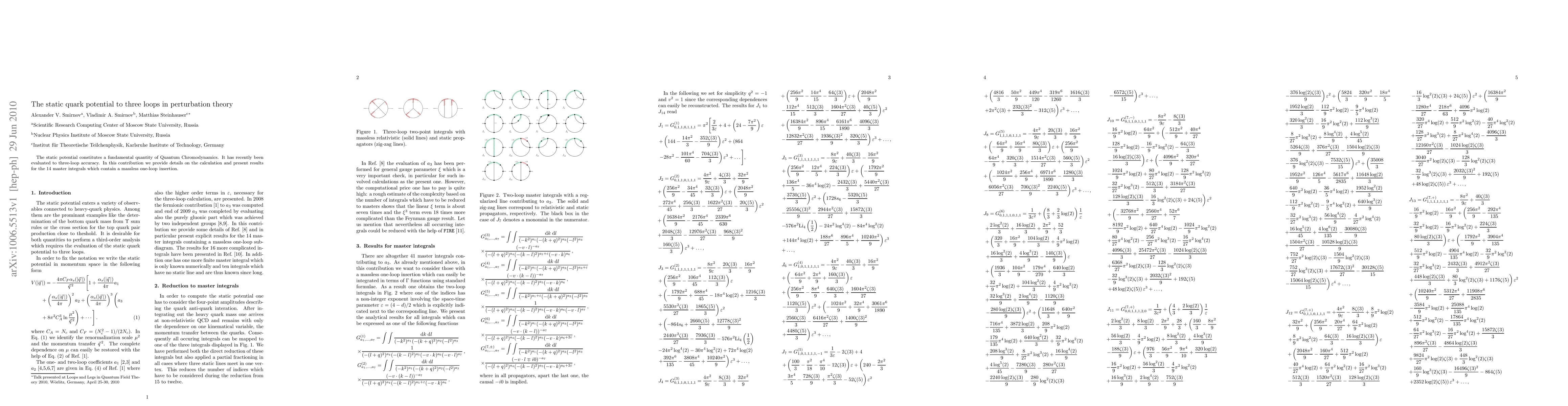 The static potential constitutes a fundamental quantity of Quantum Chromodynamics. It has recently been evaluated to three-loop accuracy. In this contribution we provide details on the calculation and present results for the 14 master integrals which contain a massless one-loop insertion.