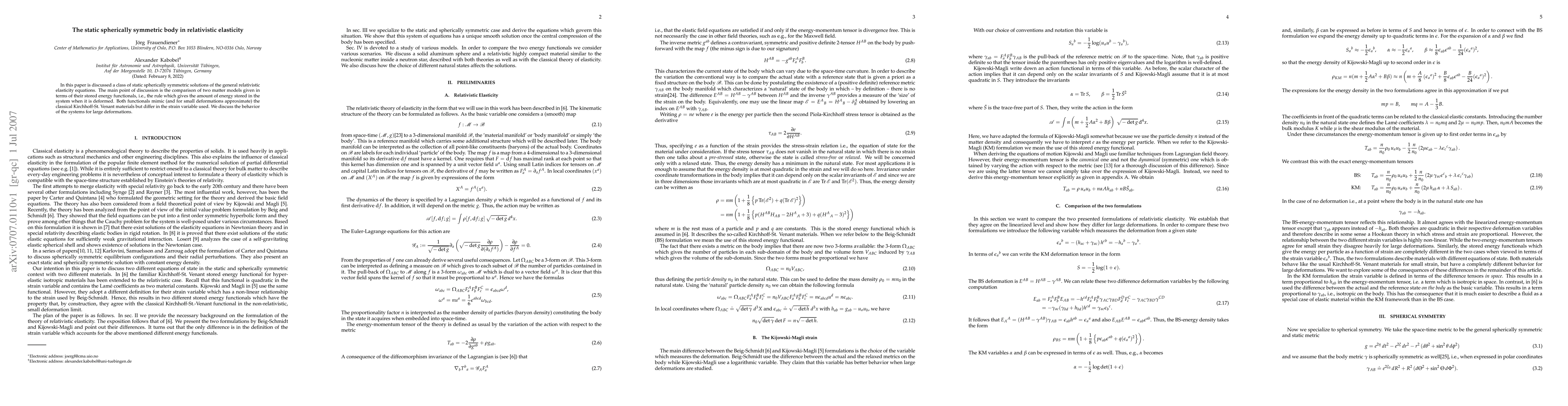 In this paper is discussed a class of static spherically symmetric solutions of the general relativistic elasticity equations. The main point of discussion is the comparison of two matter models given in terms of their stored energy functionals, i.e., the rule which gives the amount of energy stored in the system when it is deformed. Both functionals mimic (and for small deformations approximate) the classical Kirchhoff-St.Venant materials but differ in the strain variable used. We discuss the behavior of the systems for large deformations.
