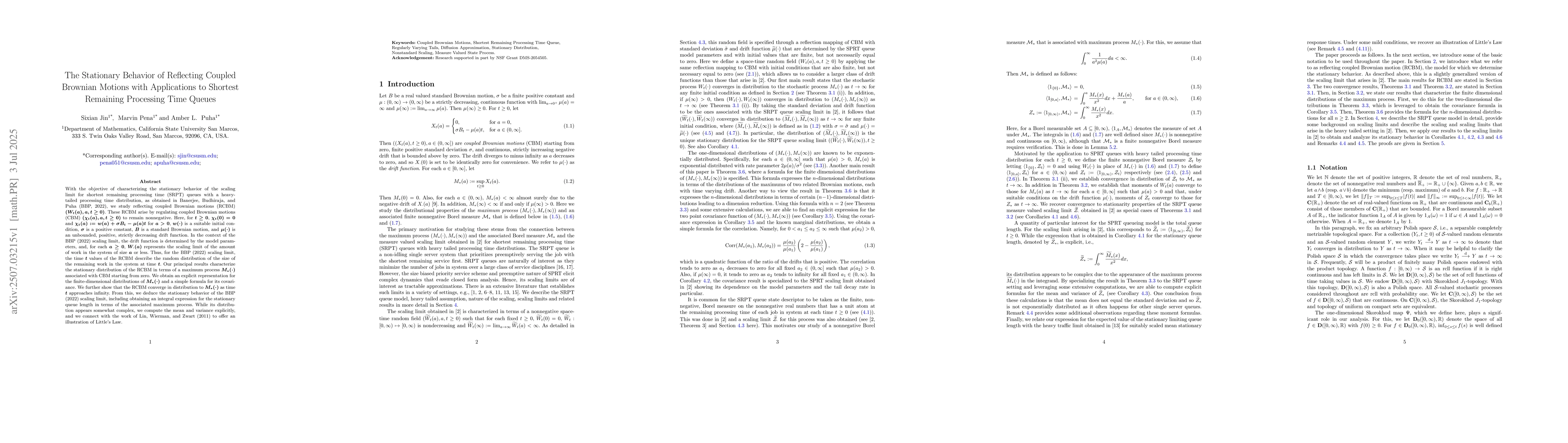 With the objective of characterizing the stationary behavior of the scaling limit for shortest remaining processing time (SRPT) queues with a heavy-tailed processing time distribution, as obtained in Banerjee, Budhiraja, and Puha (BBP, 2022), we study reflecting coupled Brownian motions (RCBM) $(W_t(a), a, t \geq 0)$. These RCBM arise by regulating coupled Brownian motions (CBM) $(\chi_t(a), a,t \geq 0)$ to remain nonnegative. Here, for $t\geq 0$, $\chi_t(0)=0$ and $\chi_t(a):=w(a)+\sigma B_t-\mu(a)t$ for $a>0$, $w(\cdot)$ is a suitable initial condition, $\sigma$ is a positive constant, $B$ is a standard Brownian motion, and $\mu(\cdot)$ is an unbounded, positive, strictly decreasing drift function. In the context of the BBP (2022) scaling limit, the drift function is determined by the model parameters, and, for each $a\geq 0$, $W_{\cdot}(a)$ represents the scaling limit of the amount of work in the system of size $a$ or less. Thus, for the BBP (2022) scaling limit, the time $t$ values of the RCBM describe the random distribution of the size of the remaining work in the system at time $t$. Our principal results characterize the stationary distribution of the RCBM in terms of a maximum process $M_*(\cdot)$ associated with CBM starting from zero. We obtain an explicit representation for the finite-dimensional distributions of $M_*(\cdot)$ and a simple formula for its covariance. We further show that the RCBM converge in distribution to $M_*(\cdot)$ as time $t$ approaches infinity. From this, we deduce the stationary behavior of the BBP (2022) scaling limit, including obtaining an integral expression for the stationary queue length in terms of the associated maximum process. While its distribution appears somewhat complex, we compute the mean and variance explicitly, and we connect with the work of Lin, Wierman, and Zwart (2011) to offer an illustration of Little's Law.