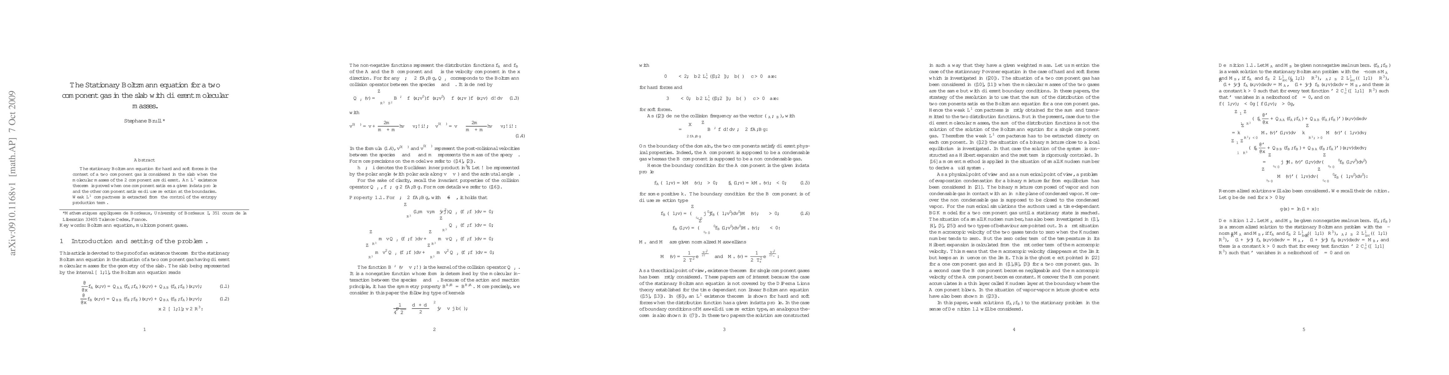 The stationary Boltzmann equation for hard and soft forces in the context of a two component gas is considered in the slab when the molecular masses of the 2 component are different. An $L^{1}$ existence theorem is proved when one component satisfies a given indata profile and the other component satisfies diffuse reflection at the boundaries. Weak $L^{1}$ compactness is extracted from the control of the entropy production term.