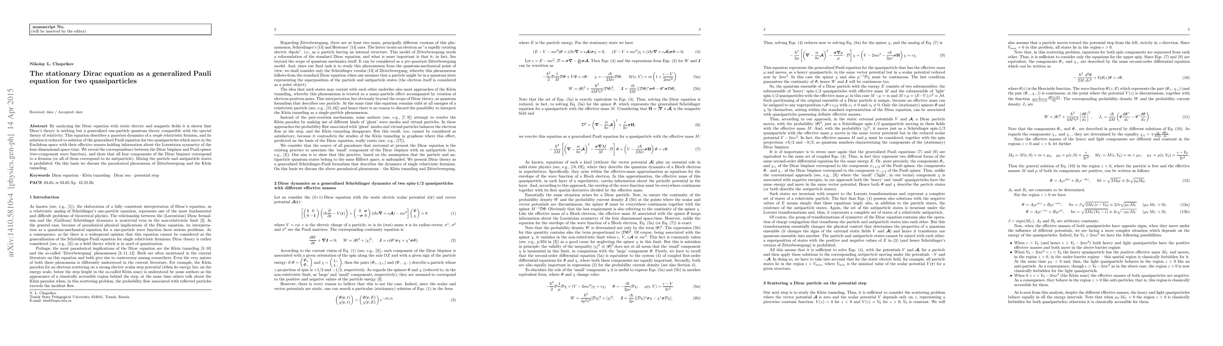By analyzing the Dirac equation with static electric and magnetic fields it is shown that Dirac's theory is nothing but a generalized one-particle quantum theory compatible with the special theory of relativity. This equation describes a {\it quantum} dynamics of a {\it single} relativistic fermion, and its solution is reduced to solution of the generalized Pauli equation for two quasiparticles which move in the Euclidean space with their effective masses holding information about the Lorentzian symmetry of the four-dimensional space-time. We reveal the correspondence between the Dirac bispinor and Pauli spinor (two-component wave function), and show that all four components of the Dirac bispinor correspond to a fermion (or all of them correspond to its antiparticle). Mixing the particle and antiparticle states is prohibited. On this basis we discuss the paradoxical phenomena of Zitterbewegung and the Klein tunneling.