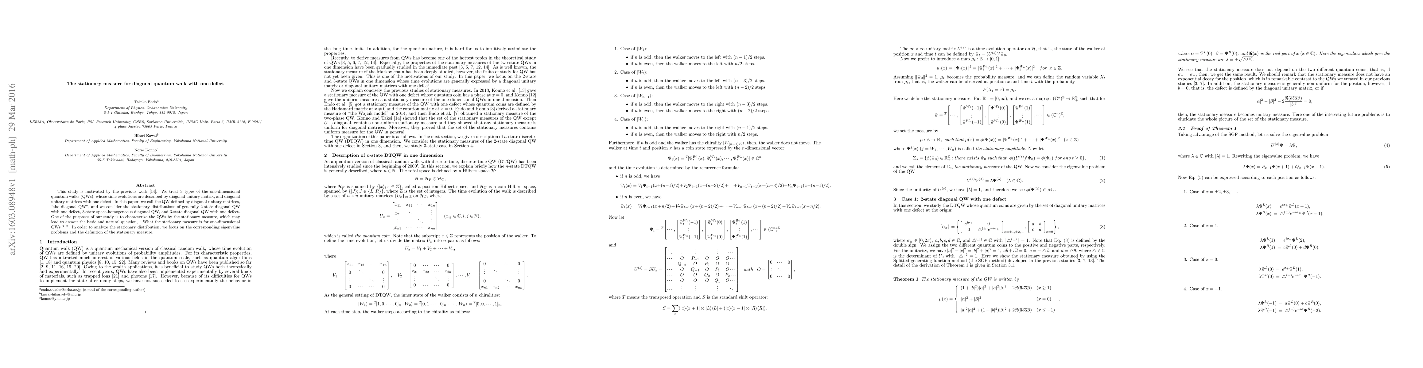 This study investigates stationary measures for diagonal quantum walks with one defect, aiming to characterize their behavior and provide insights into the nature of one-dimensional quantum walks.