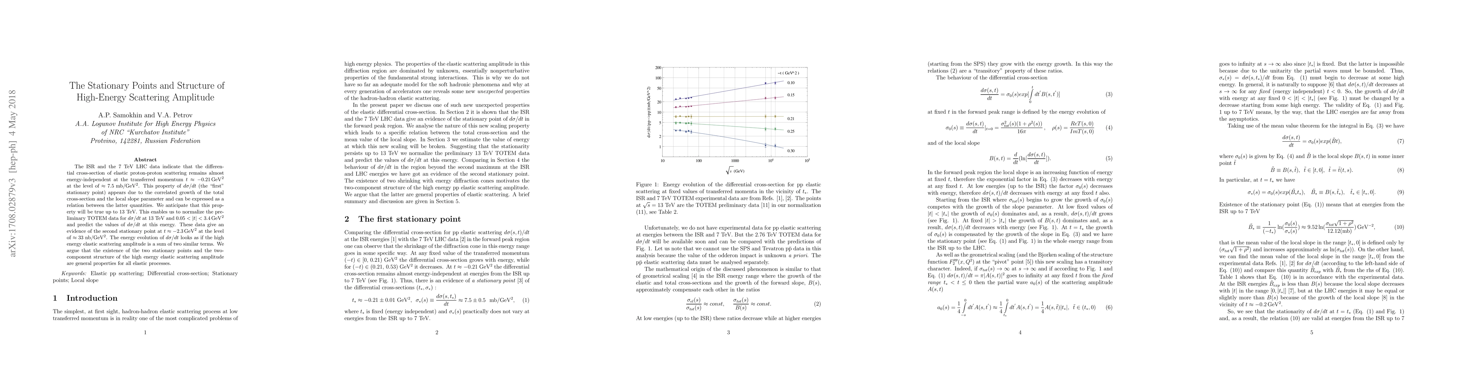 The ISR and the 7 TeV LHC data indicate that the differential cross-section of elastic proton-proton scattering remains almost energy-independent at the transferred momentum $t\approx - 0.21\, \mathrm{GeV}^{2}$ at the level of $\approx 7.5 \mathrm{\ mb}/\mathrm{GeV}^{2}$. This property of $ d\sigma/dt$ (the "first" stationary point) appears due to the correlated growth of the total cross-section and the local slope parameter and can be expressed as a relation between the latter quantities. We anticipate that this property will be true up to 13 TeV. This enables us to normalize the preliminary TOTEM data for $ d\sigma/dt$ at 13 TeV and $ 0.05 < |t| < 3.4\, \mathrm{GeV}^{2}$ and predict the values of $ d\sigma/dt$ at this energy. These data give an evidence of the second stationary point at $t\approx - 2.3\,\mathrm{GeV}^{2}$ at the level of $\approx 33 \mathrm{\ nb}/\mathrm{GeV}^{2}$. The energy evolution of $ d\sigma/dt$ looks as if the high energy elastic scattering amplitude is a sum of two similar terms. We argue that the existence of the two stationary points and the two-component structure of the high energy elastic scattering amplitude are general properties for all elastic processes.