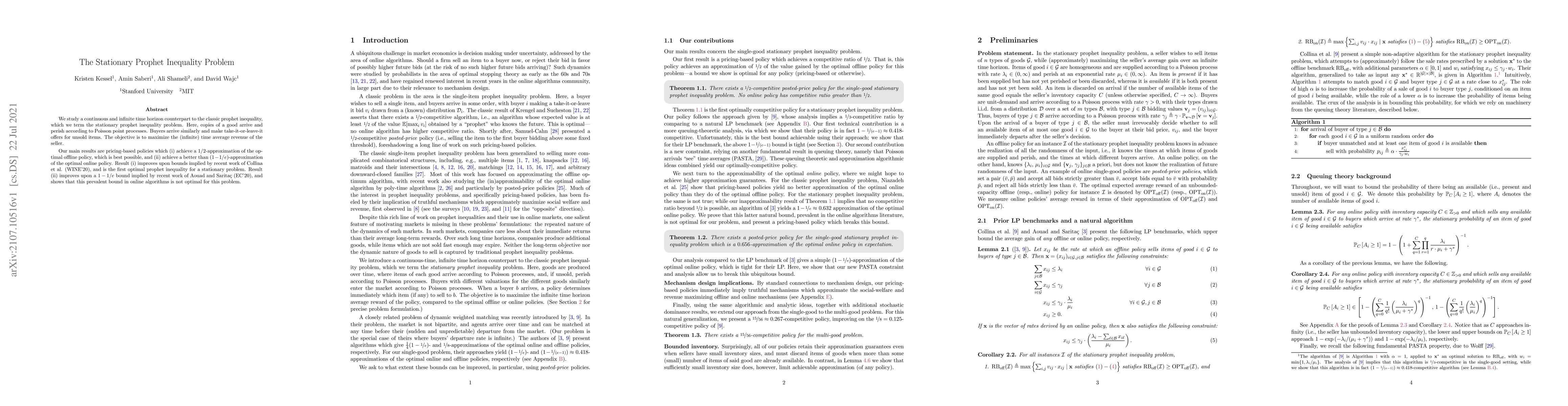 We study a continuous and infinite time horizon counterpart to the classic prophet inequality, which we term the stationary prophet inequality problem. Here, copies of a good arrive and perish according to Poisson point processes. Buyers arrive similarly and make take-it-or-leave-it offers for unsold items. The objective is to maximize the (infinite) time average revenue of the seller. Our main results are pricing-based policies which (i) achieve a $1/2$-approximation of the optimal offline policy, which is best possible, and (ii) achieve a better than $(1-1/e)$-approximation of the optimal online policy. Result (i) improves upon bounds implied by recent work of Collina et al. (WINE'20), and is the first optimal prophet inequality for a stationary problem. Result (ii) improves upon a $1-1/e$ bound implied by recent work of Aouad and Sarita\c{c} (EC'20), and shows that this prevalent bound in online algorithms is not optimal for this problem.