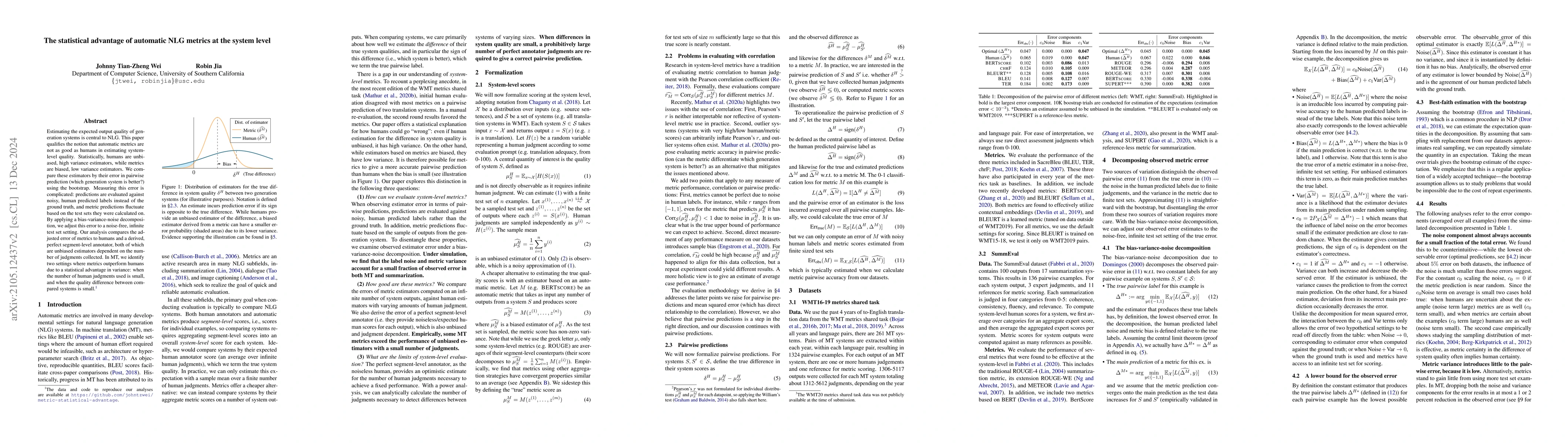 Estimating the expected output quality of generation systems is central to NLG. This paper qualifies the notion that automatic metrics are not as good as humans in estimating system-level quality. Statistically, humans are unbiased, high variance estimators, while metrics are biased, low variance estimators. We compare these estimators by their error in pairwise prediction (which generation system is better?) using the bootstrap. Measuring this error is complicated: predictions are evaluated against noisy, human predicted labels instead of the ground truth, and metric predictions fluctuate based on the test sets they were calculated on. By applying a bias-variance-noise decomposition, we adjust this error to a noise-free, infinite test set setting. Our analysis compares the adjusted error of metrics to humans and a derived, perfect segment-level annotator, both of which are unbiased estimators dependent on the number of judgments collected. In MT, we identify two settings where metrics outperform humans due to a statistical advantage in variance: when the number of human judgments used is small, and when the quality difference between compared systems is small. The data and code to reproduce our analyses are available at https://github.com/johntzwei/metric-statistical-advantage .
