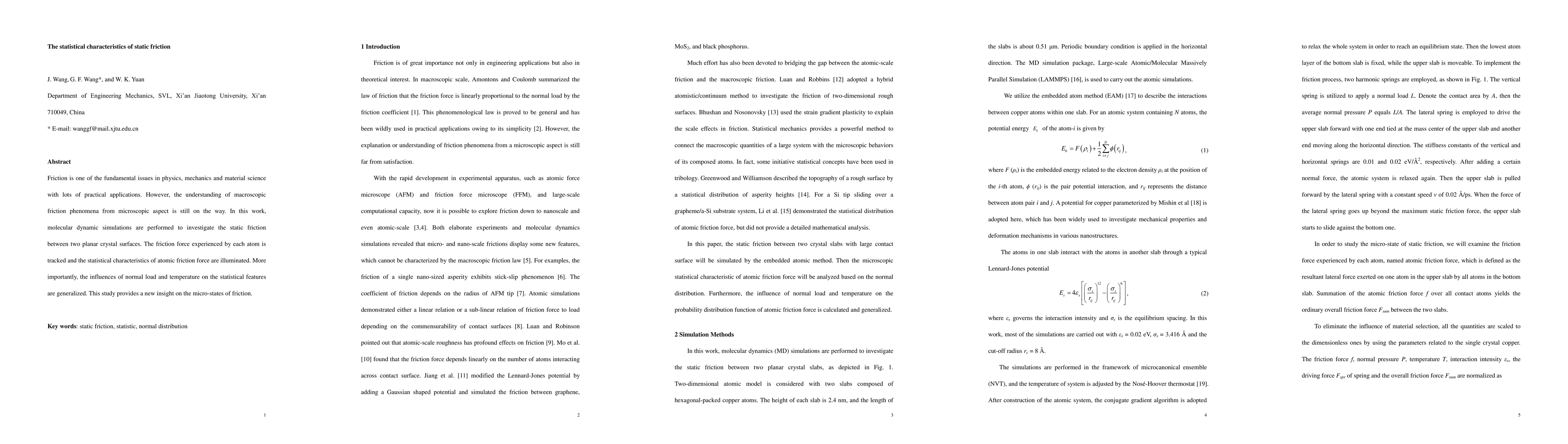 Researchers used molecular dynamic simulations to study static friction between two planar crystal surfaces, revealing new insights into the microstates of friction and its statistical characteristics, which can inform understanding of normal load and temperature effects.