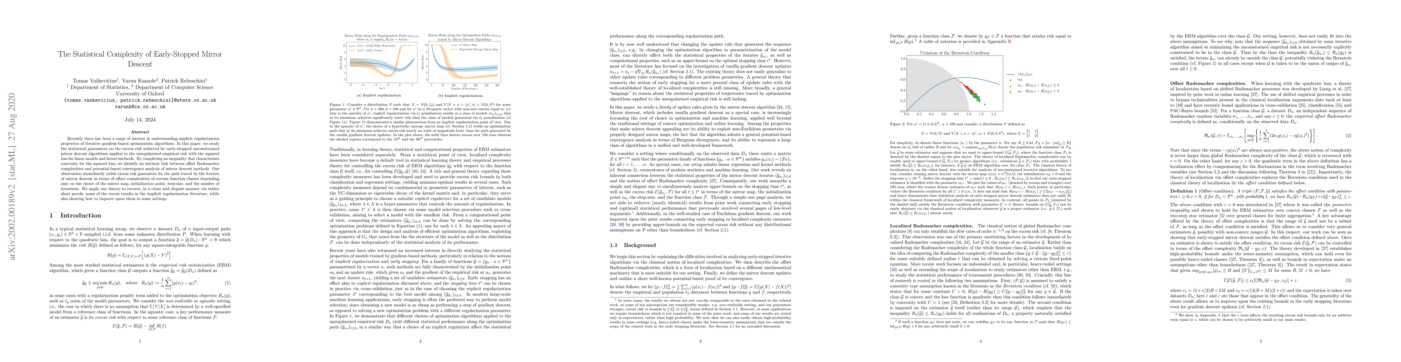 This paper investigates the statistical guarantees of early-stopped mirror descent algorithms for optimization, establishing a connection between offset Rademacher complexities and convergence analysis. It provides excess risk guarantees based on intrinsic properties of the mirror map, initialization, step-size, and iteration count, and improves upon recent results in implicit regularization.